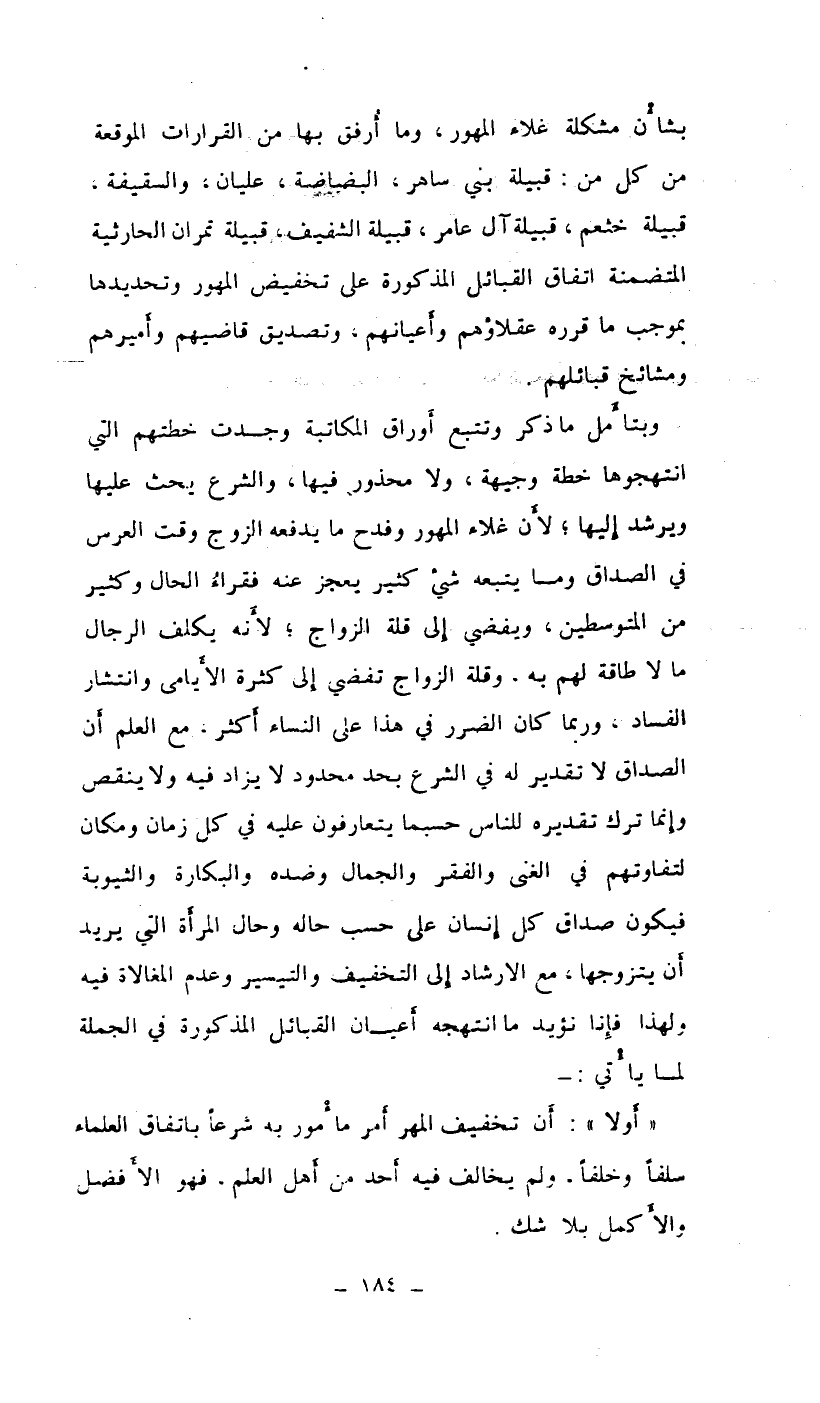 وبتأمل ما ذكر وتتبع أوراق المكاتبة وجدت خطتهم التي انتهجوها خطة وجيهة، ولا محذور فيها، والشرع يحث عليها ويرشد إليها، لأن غلاء المهور وفدح ما يدفعه الزوج وقت العرس في الصداق وما يتبعه شيء كثير يعجز عنه فقراء الحال وكثير من المتوسطين ويفضي إلى قلة الزواج، لأنه يكلف الرجال ما لا طاقة لهم به. وقلة الزواج تفضي إلى كثرة الأيامى وانتشار الفساد، وربما كان الضرر في هذا على النساء أكثر، مع العلم أن الصداق لا تقدير له في الشرع بحد محدود لا يزاد فيه ولا ينقص وإنما ترك تقديره للناس حسبما يتعارفون عليه في كل زمان ومكان لتفاوتهم في الغنى والفقر والجمال وضده والبكارة والثيوبة فيكون صداق كل إنسان على حسب حاله وحال المرأة التي يريد أن يتزوجها، مع الإرشاد إلى التخفيف والتيسير وعدم المغالاة فيه ولهذا فإننا نؤيد ما انتهجه أعيان القبائل المذكورة في الجملة لما يأتي: