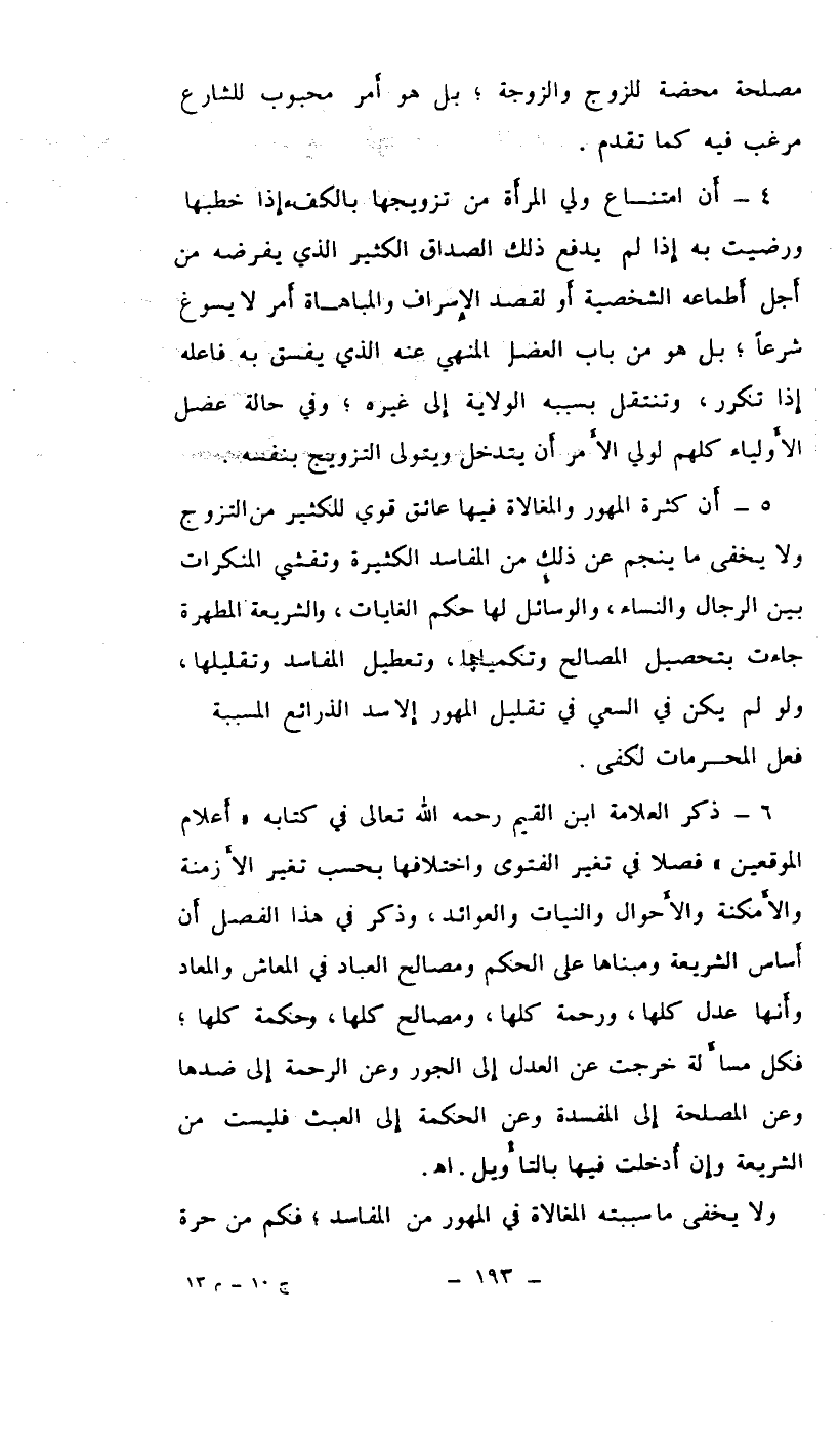 4- أن امتناع ولي الأمر من تزويجها بالكفء إذا خطبها ورضيت به إذا لم يدفع ذلك الصداق الكثير الذي يفرضه من اجل أطماعه الشخصية أو لقصد الإسراف والمباهاة أمر لا يسوغ شرعاً بل هو من باب العضل المنهي عنه الذي يفسق به فاعله إذا تكرر، وتنتقل بسببه الولاية إلى غيره، وحالة عضل الأولياء كلهم لولي الأمر أن يتدخل ويتولى التزويج بنفسه.
