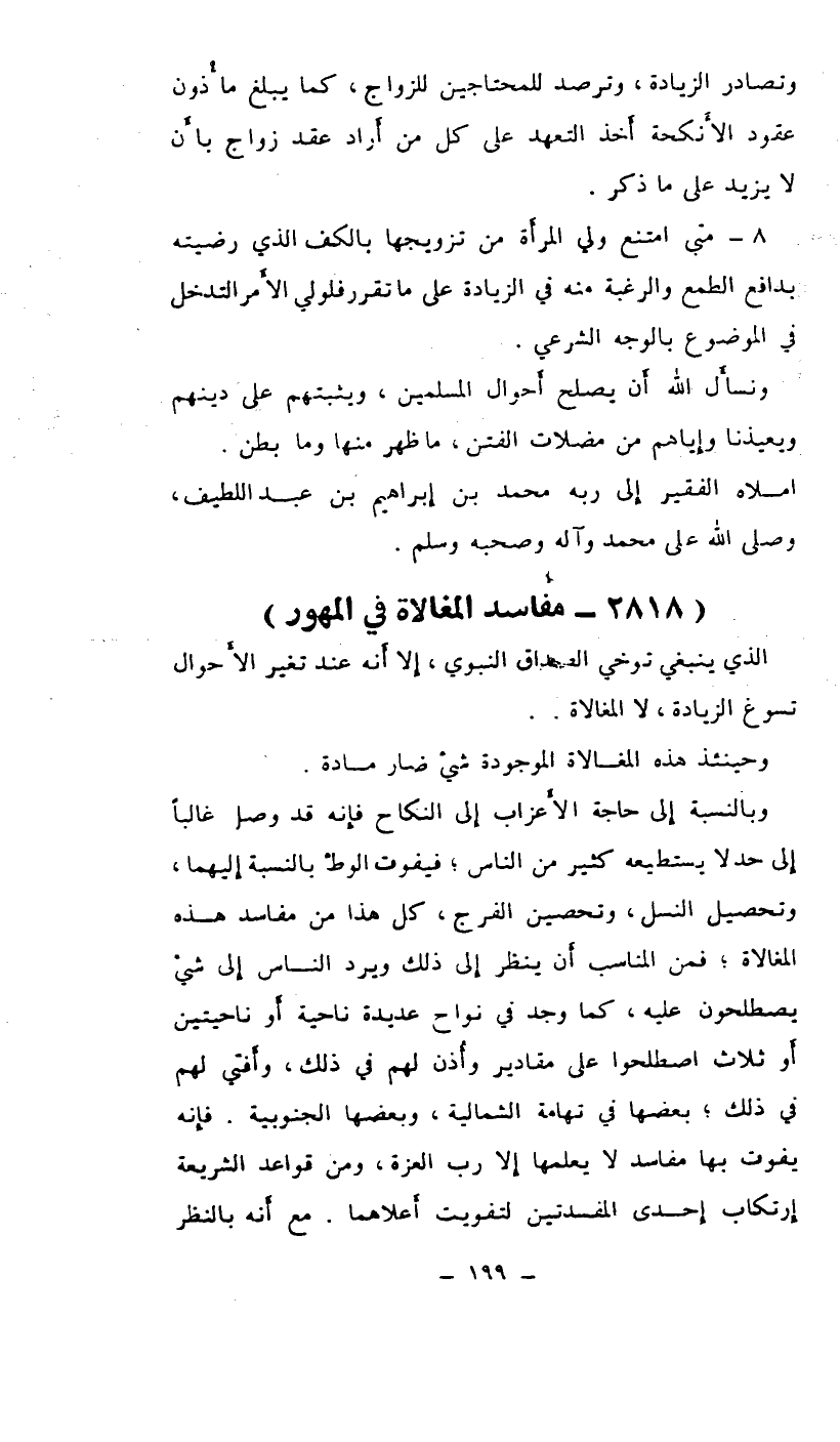 وبالنسبة إلى حاجة الأعزاب إلى النكاح فإنه قد وصل غالباً إلى حد لا يستطيعه كثير من الناس فيفوت الوطء بالنسبة إليهما، وتحصيل السنل، وتحصين الفرج، كل هذا من مفاسد هذه المغالاة، فمن المناسب أن ينظر إلى ذلك ويرد الناس إلى شيء يصطلحون عليه، كما وجد في نواح عديدة ناحية أو ناحيتين أو ثلاث اصطلحوا على مقادير وأذن لهم في ذلك. وأفتي لهم في ذلك. بعضها في تهامة الشمالية وبعضها الجنوبية. فإنه يفوت بها مفاسد لا يعملها إلا رب العزة، ومن قواعد الشريعة إرتكاب إحدى المفسدتين لتفويت أعلاهما. مع أنه بالنظر