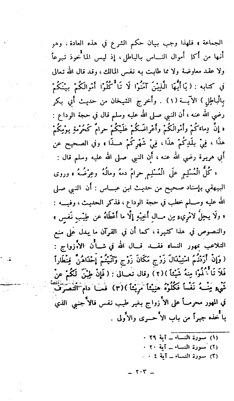 الجماعة) فلهذا وجب بيان حكم الشرع في هذه العادة. وهو أنها من أكل أموال الناس بالباطل، إذ ليس المأخوذ تبرعاً ولا عقد معاوضة ولا مما طالبت به نفس المالك. وقد قال الله تعالى في كتابه {يا أيها الذين آمنوا لا تأكلوا أموالكم بينكم بالباطل} الآية (¬1) . وأخرج الشيخان من حديث أبي بكر رضي الله عنه، أن النبي صلى الله عليه وسلم قال في حجة الوداع: (إن دمائكم وأموالكم وأعراضكم عليكم حرام كحرمة يومكم هذا في بلدكم هذا في شهركم هذا) وفي الصحيح عن أبي هريرة رضي الله عنه، أن النبي صلى الله عليه وسلم قال: (كل المسلم على المسلم حرام دمه وماله وعرضه) وروى البيهقي بإسناد صحيح من حديث ابن عباس: أن النبي صلى الله عليه وسلم خطب في حجة الوداع، فذكر الحديث، وفيه (ولا يحل لامرئ من مال أخيه إلا ما أعطاه عن طيب نفس) والنصوص في هذا كثيرة، كما أن القرآن ما يدل على منع التلاعب بمهور النساء فقد قال الله في شأن الأزواج: {وإن أردتم استبدال زوج مكان زوج وآتيتم إحداهن قنطاراً فلا تأخذوا منه شيئاً} (¬2) وقال تعالى: {فإن طبن لكم عن شيء منه نفساً فكلوه هنيئاً مريئاً} (¬3) فما دام التصرف في المهور محرماً على الأزواج بغير طيب نفس بالأجنبي الذي يأخذه جبراً من باب الأحرى والأولى.