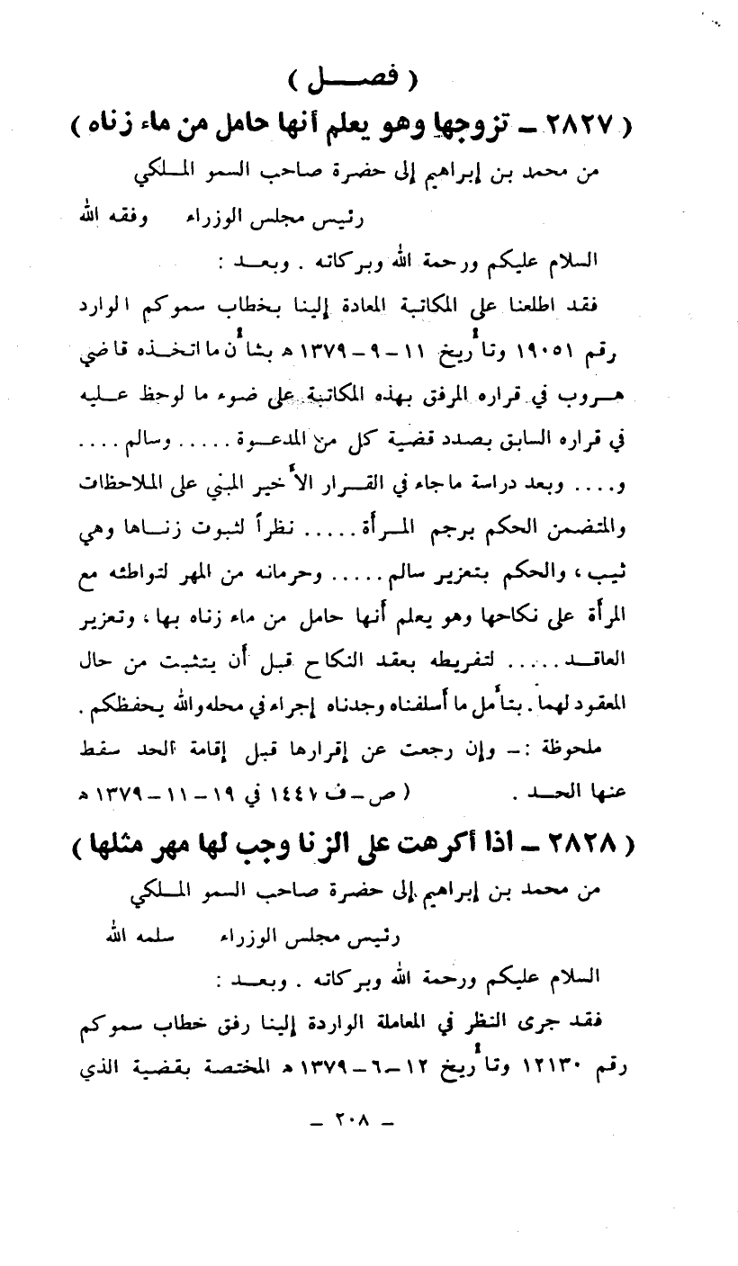 فقد اطلعناا على المكاتبة المعادة إلينا بخطاب سموكم الوارد رقم 19051 وتاريخ 11-9-1379هـ بشأن ما اتخذه قاضي هروب في قراره المرفق بهذه المتكاتبة على ضوء ما لوحظ عليه في قراره السابق بصدد قضية كل من المدعوة...... وسالم...... و...... وبعد دراسة ما جاء في القرار الأخير المبني على الملاحظات والمتضمن الحكم برجم المرأة ... نظراً لثبوت زناها وهي ثيب، والحكم بتعزير سالم.... وحرمانه من المهر لتواطئه مع المرأة على نكاحها وهو يعلم أنها حامل من ماء زناه بها، وتعزير العاقد.... لتفريطه بعقد النكاح قبل أن يتثبت من حال المعقود لهما. بتأمل ما أسلفناه وجدناه إجراء في محله والله يحفظكم.