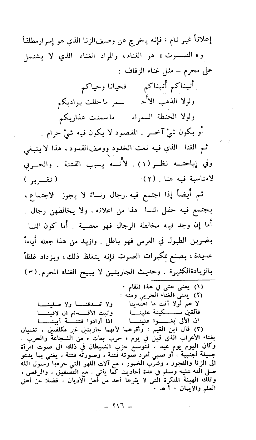 (¬3) قال ابن القيم: وأقرهما لأنهما جاريتين غير مكلفتين، تغنيان بغناء الأعراب الذي قيل في يوم (حرب بعاث) من الشجاعة والحرب. وكان اليوم يوم عيد، فتوسع حزب الشيطان في ذلك إلى صوت امرأة جميلة أجنبية، أو صبي أمرد صوته فتنة، وصورته فتنة، يغني بما يدعو إلى الزنا والفجور وشرب الخمور مع آلات اللهو التي حرمها رسول الله صلى الله عليه وسلم في عدة أحاديث كما يأتي مع التصفيق والرقص، وتلك الهيئة المنكرة التي لا يقرها أحد من أهل الأديان، فضلاً عن أهل العلم والإيمان. اهـ.