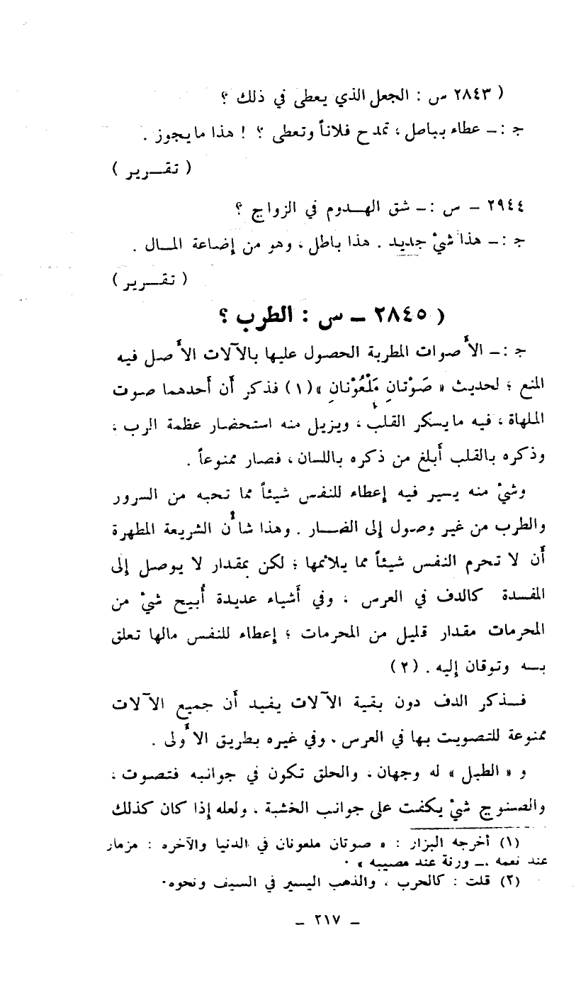 ج: الأصوات المطربة الحصول عليها بالآلات الأصل فيه المنع، لحديث (صوتان ملعونان) (¬1) فذكر أن أحدهما صوت الملهاة، فيه ما يسكر القلب، ويزيل منه استحضار عظمة الرب، وذكره بالقلب أبلغ من ذكره باللسان، فصار ممنوعاً.