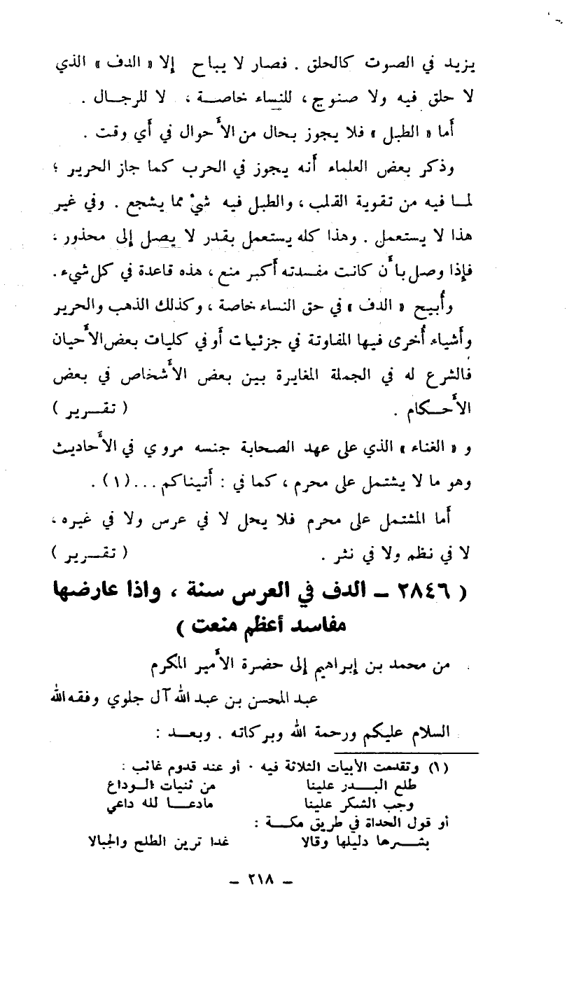 الدف في العرس سنة، وإذا عارضها مفاسد أعظم منعت