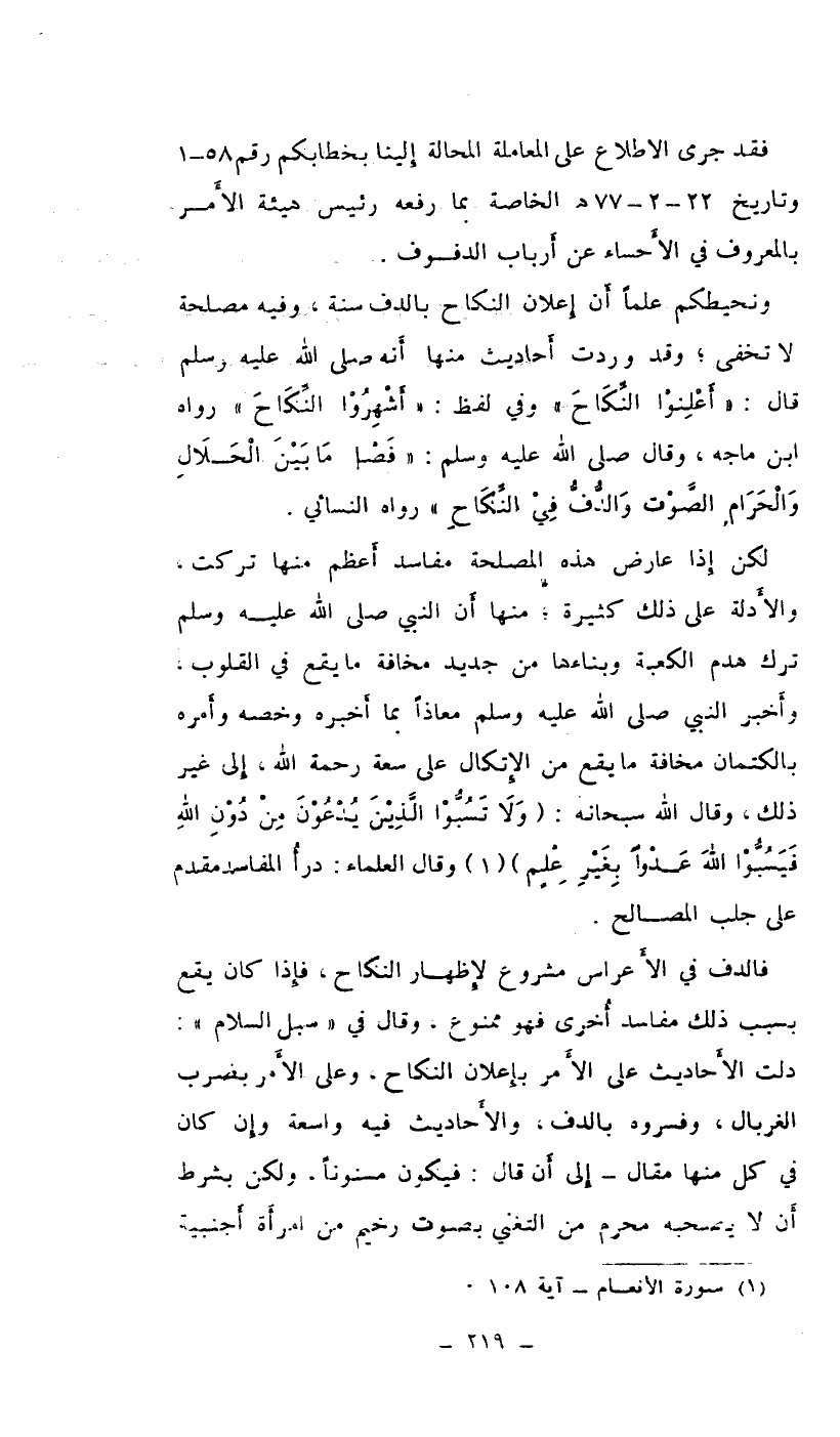 فقد جرى الإطلاع على المعاملة المحالة إلينا بخطابكم رقم 58-1 وتاريخ 22-2-77هـ الخاصة بما رفعه رئيس هيئة الأمر بالمعروف في الإحساء عن أرباب الدفوف.