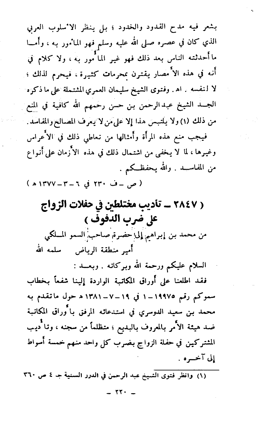 فقد اطلعنا على أوراق المكاتبة الواردة إلينا شفعاً بخطاب سموكم رقم 19975-1 في 19-7-1381هـ حول ما تقدم به سعيد الدوسري في استدعائه المرفق بأوراق المكاتبة ضد هيئة الأمر بالمعروف بالبديع، متظلماً من سجنه، وتأديب المشتركين في حفلة الزواج بضرب كل واحد منهم خمسة أسواط إلى آخره.