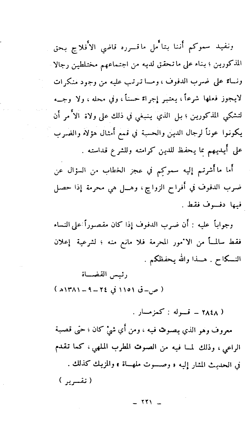 ونفيد سموكم أننا بتأمل ما قرره قاضي الأفلاج بحق المذكورين، بناء على ما تحقق لديه من اجتماعهم مختلطين رجالاً ونساءً على ضرب الدفوف، وما ترتب عليه من وجود منكرات لا يجوز فعلها شرعاً، يعتبر إجراءً حسناً، وفي محله، ولا وجه لتشكي المذكورين، بل الذي ينبغي في ذلك على ولاة الأمر أن يكونوا عوناً لرجال الدين والحسبة في قمع أمثال هؤلاء والضرب على أيديهم بما يحفظ للدين كرامته وللشرع قداسته.