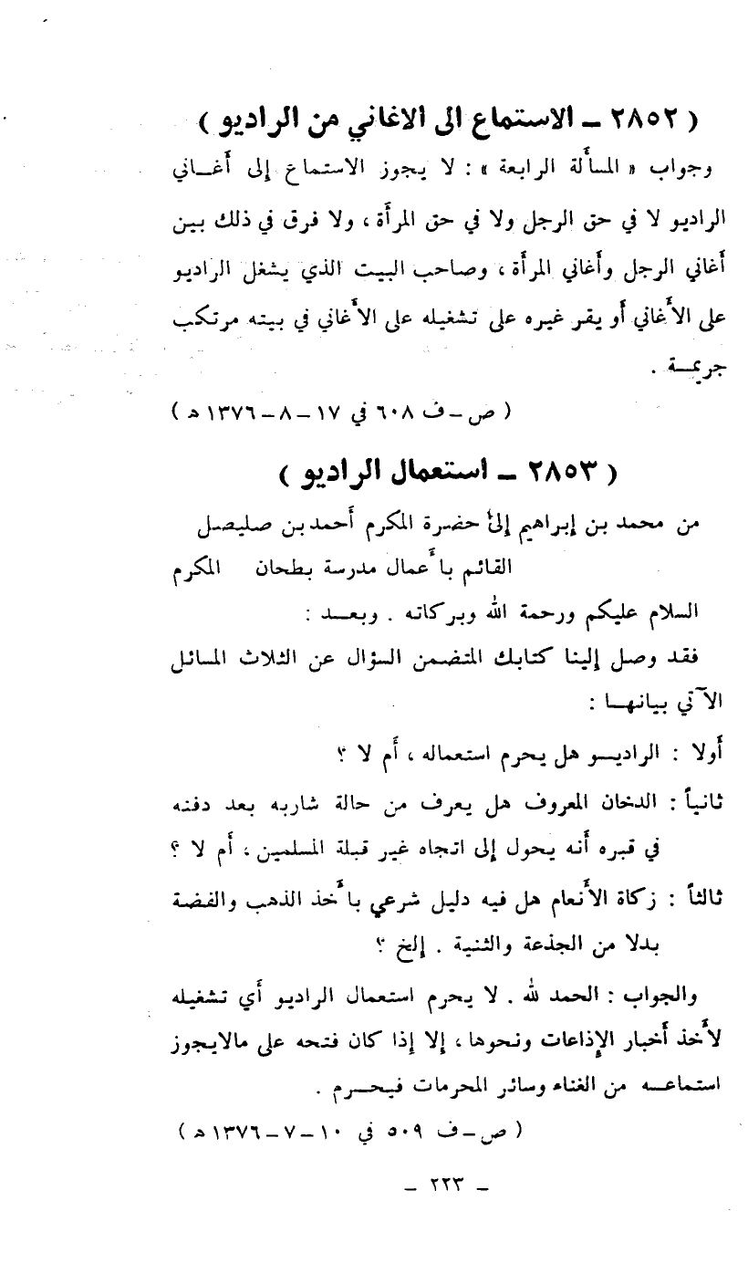 وجواب (المسألة الرابعة) : لا يجوز الاستماع إلى أغاني الراديو لا في حق الرجل ولا في حق المرأة، ولا فرق في ذلك بين أغاني الرجل وأغاني المرأة، وصاحب البيت الذي يشغل الراديو على الأغاني أو يقر غيره على تشغيله على الأغاني في بيته مرتكب جريمة.
