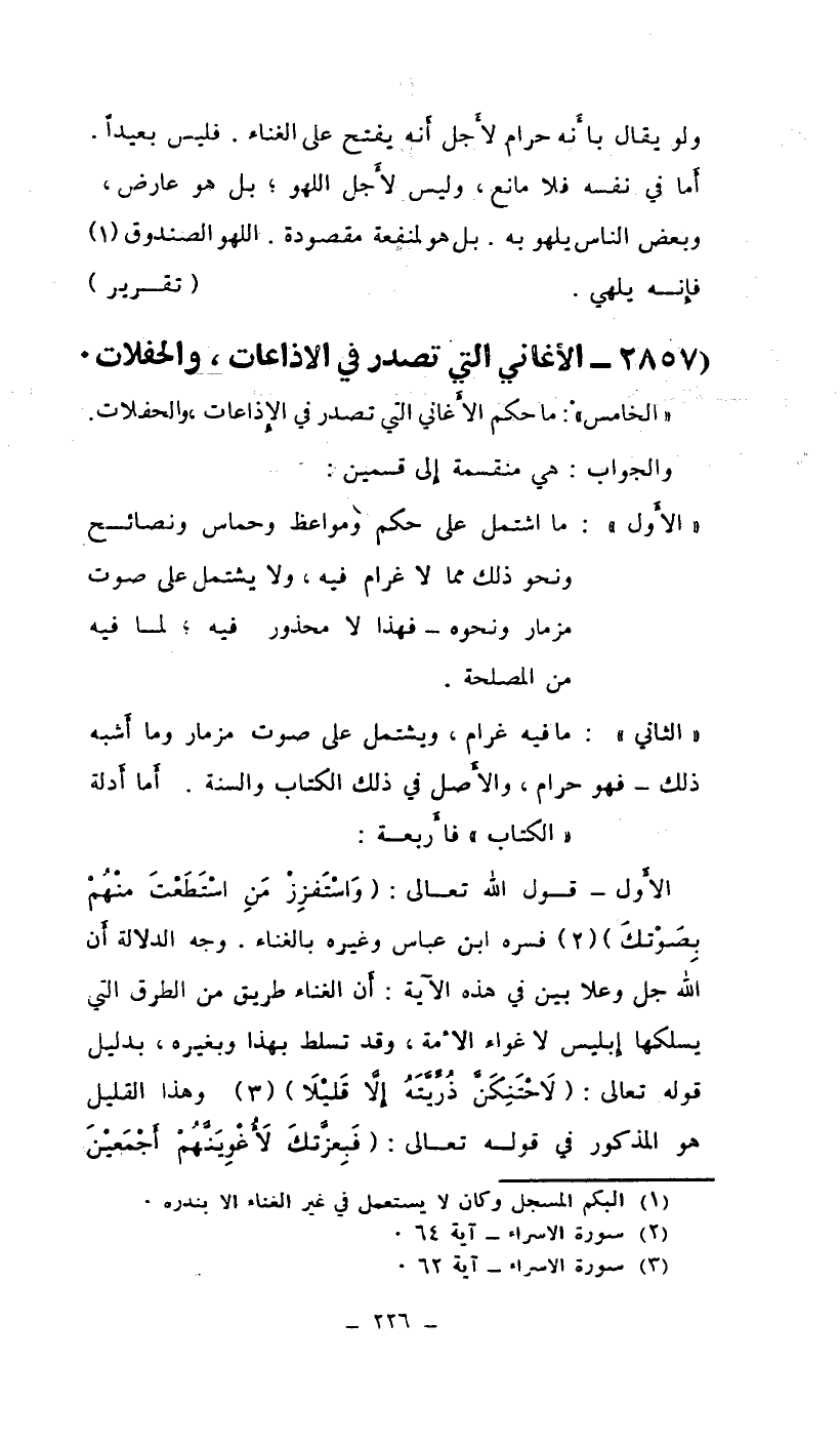 الأول: قوله تعالى: {واستفزز من استطعت منهم بصوتك} (¬2) فسره ابن عباس وغيره بالغناء. وجه الدلالة أن الله جل وعلا بين في هذه الآية: أن الغناء طريق من الطرق التي يسلكها إبليس لإغواء الأمة، وقد تسلط بهذا وبغيره، بدليل قوله تعالى: {لاحتنكن ذريته إلا قليلاً} (¬3) وهذا القليل هو المذكور في قوله تعالى: {فبعزتك لأغوينهم أجمعين