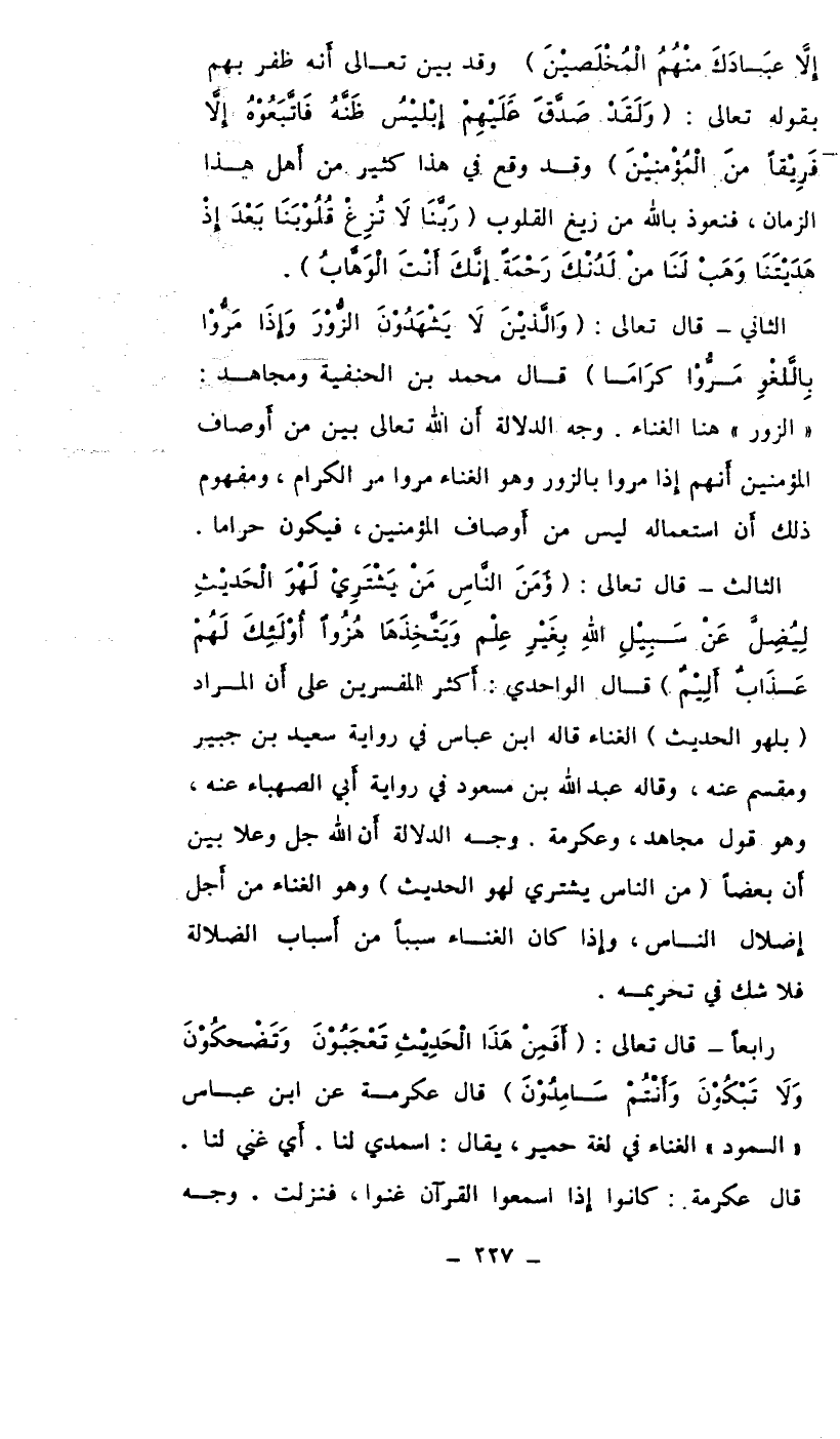 الثالث: قال تعالى: {ومن الناس من يشتري لهو الحديث ليضل عن سبيل الله بغير علم ويخذها هزواً أولئك لهم عذاب أليم} قال الواحدي: أكثر المفسرين على أن المراد (بلهو الحديث) الغناء قاله ابن عباس في رواية سعيد بن جبير ومقسم عنه، وقاله عبد الله بن مسعود في رواية أبي الصهباء عنه، وهو قول مجاهد وعكرمة. وجه الدلالة أن الله جل وعلا بين أن بعضاً (من الناس يشتري لهو الحديث) وهو الغناء من أجل إضلال الناس، وإذا كان الغناء سبباً من أسباب الضلالة فلا شك في تحريمه.