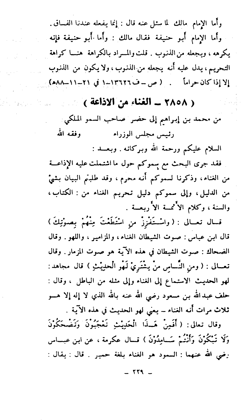 فقد جرى البحث مع سموكم حول ما اشتملت عليه الإذاعة من الغناء، وذكرنا لسموكم أنه محرم، وقد طلبتم البيان بشيء من الدليل، وإلى سموكم دليل تحريم الغناء من: الكتاب، والسنة، وكلام الأئمة الأربعة.