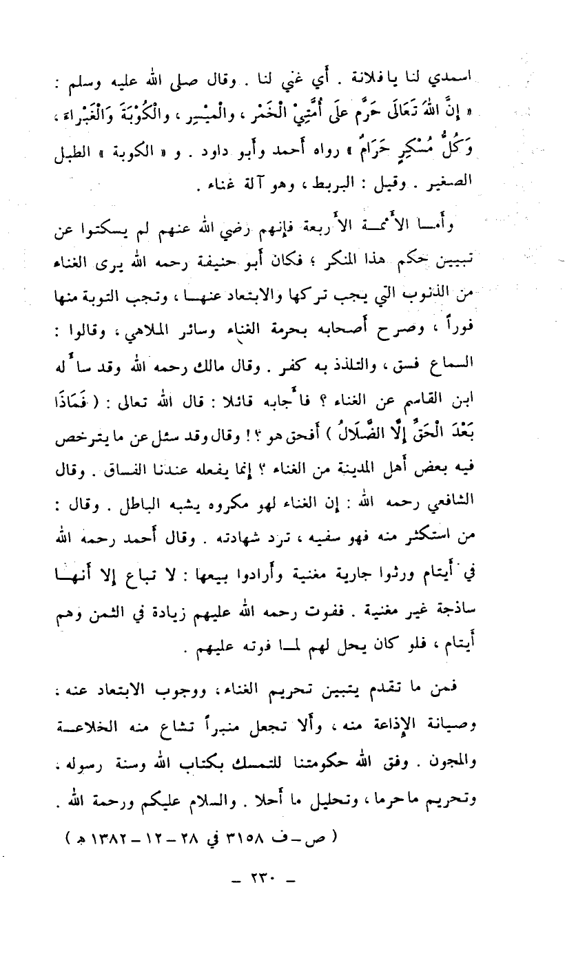 فمن ما تقدم يتبين تحريم الغناء، ووجوب الابتعاد عنه، وصيانة الإذاعة منه، وألا تجعل منبراً تشاع منه الخلاعة والمجون. وفق الله حكومتنا للتمسك بكتاب الله وسنة رسوله. وتحريم ما حرما، وتحليل ما أحلا. والسلام عليكم ورحمة الله.