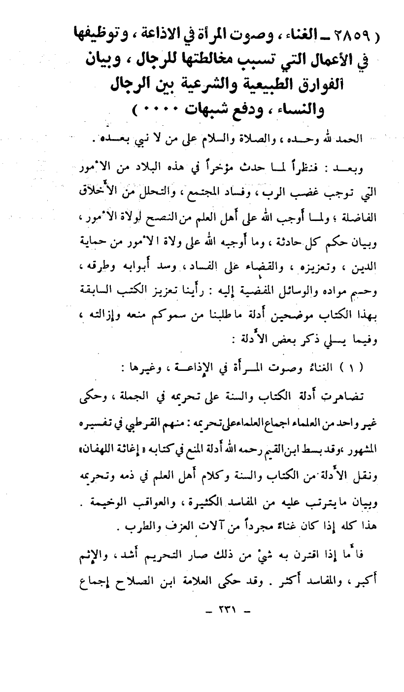 الغناء، وصوت المرأة في الإذاعة، وتوظيفها في الأعمال التي تسبب مخالطتها للرجال، وبيان الفوارق الطبيعية والشرعية بين الرجال والنساء، ودفع شبهات ...