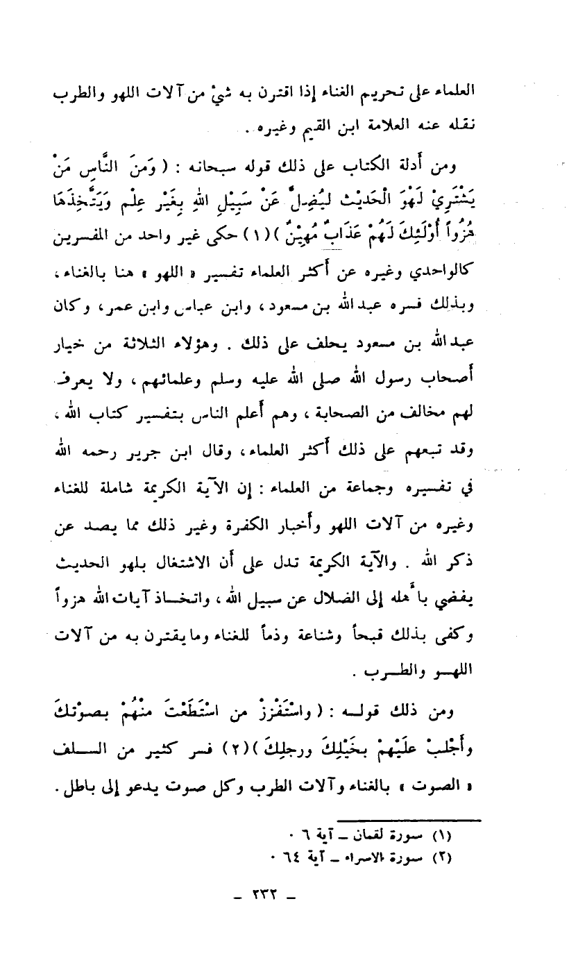 ومن أدلة الكتاب على ذلك قوله سبحانه: {ومن الناس من يشتري لهو الحديث ليضل عن سبيل الله بغير علم ويتخذها هزواً أولئك لهم عذاب مهين} (¬1) حكى غير واحد من المفسرين كالواحدي وغيره عن أكثر العلماء تفسير (اللهو) هنا بالغناء. وبذلك فسره عبد الله بن مسعود، وابن عباس وابن عمر، وكان عبد الله بن مسعود يحلف على ذلك. وهؤلاء الثلاثة من خيار أصحاب رسول الله صلى الله عليه وسلم وعلمائهم، ولا يعرف لهم مخالف من الصحابة وهم أعلم الناس بتفسير كتاب الله.