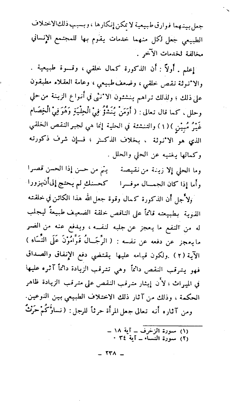 إعلم. أولاً: أن الذكورة كمال خلقي، وقوة طبيعية. والأنوثة نقص خلقي، وضعف طبيعي، وعامة العقلاء مطبقون على ذلك، ولذلك تراهم ينشئون الأنثى في أنواع الزينة من حلي وحلل. كما قال تعالى: {أومن ينشؤ في الحلية وهو في الخصام غير مبين} (¬1) والتنئشة في الحلية إنما هي لجبر النقص الخلقي الذي هو الأنوثة. بخلاف الذكر، فإن شرف ذكورته وكمالها يغنيه عن الحلي والحلل.