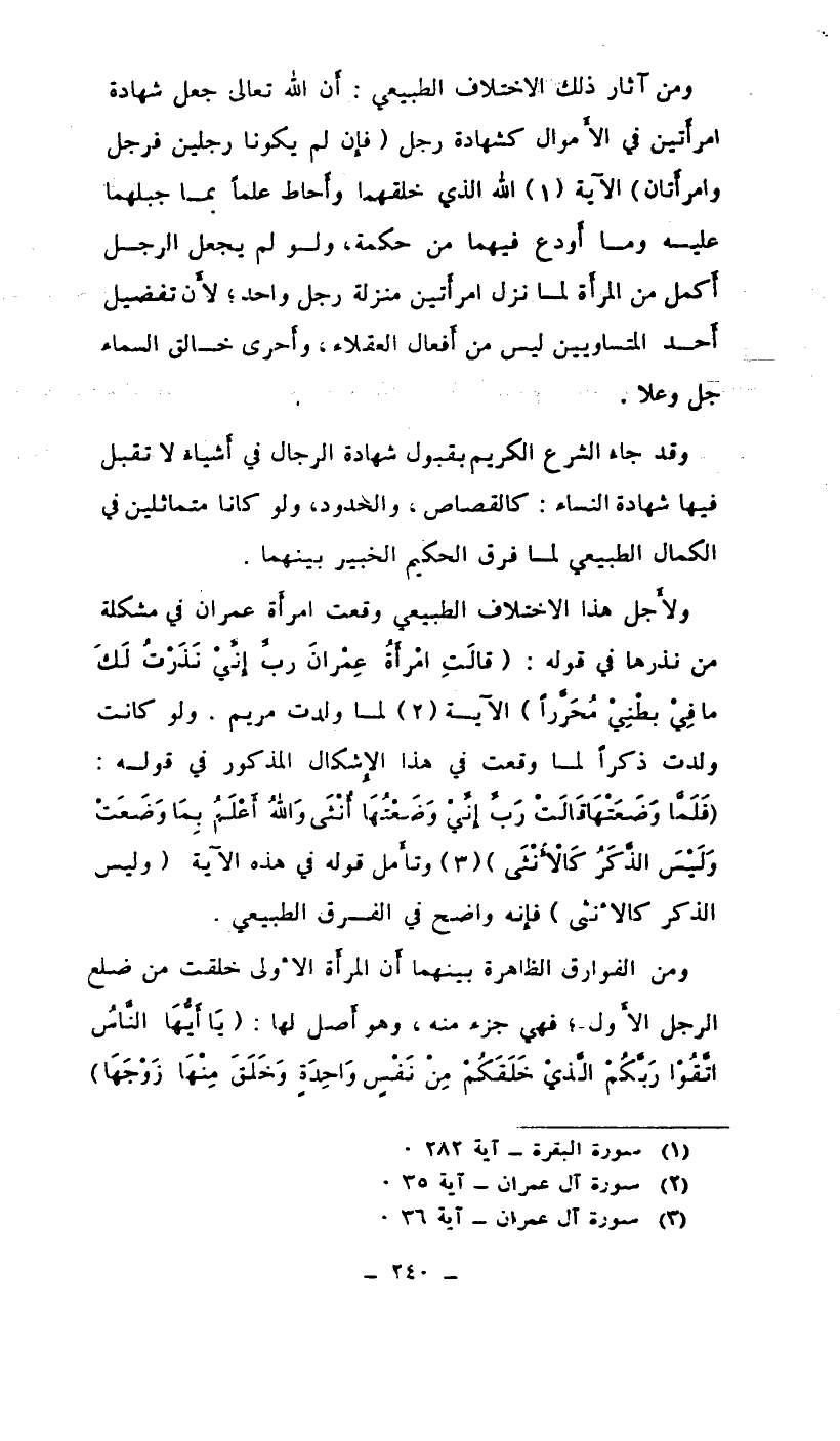 ولأجل هذا الاختلاف الطبيعي وقعت امرأة عمران في مشكلة من نذرها في قوله: {قالت امرأة عمران رب إني نذرت لك ما في بطني محرراً} الآية (¬2) . لما ولدت مريم. ولو كانت ولدت ذكراً لما وقعت في هذا الإشكال المذكور في قوله: {فلما وضعتها قالت رب إني وضعتها أنثى والله أعلم بما وضعت وليس الذكر كالأنثى} الآية (¬3) . وتأمل قوله في هذه الآية {وليس الذكر كالأنثى} فإنه واضح في الفرق الطبيعي.