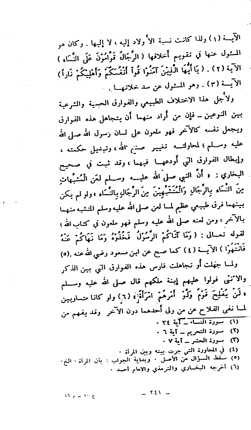 ولأجل هذا الاختلاف الطبيعي والفوارق الحسبة والشرعية بين النوعين فإن من أراد منهما أن يتجاهل هذه الفوارق ويجعل نفسه كالآخر فهو ملعون على لسان رسول الله صلى الله عليه وسلم، لمحاولته تغيير صنع الله، تبديل حكمته، وإبطال الفوارق التي أودعها فيهما، وقد ثبت في صحيح البخاري: (أن النبي صلى الله عليه وسلم لعن المشبهات من النساء بالرجال والمتشبهين من الرجال بالنساء) ولو لم يكن بينهما فرق طبيعي عظيم لما لعن صلى الله عليه وسلم المتشبه منهما بالآخر. ومن لعنه صلى الله عليه وسلم فهو ملعون في كتاب الله، لقوله تعالى: {وما أتاكم الرسول فخذوه وما نهاكم عنه فانتهوا} الآية (¬4) ، كما صح عن ابن مسعود رضي الله عنه (¬5) .
