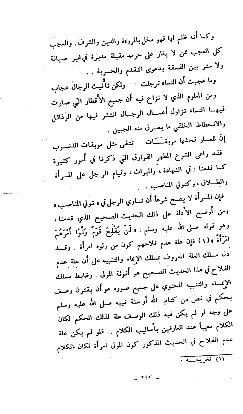 فإن للمرأة لا يصح شرعاً أن تساوي الرجل من (تولي المناصب) ومن أوضح الأدلة على ذلك الحديث الصحيح الذي قدمنا: وهو قوله صلى الله عليه وسلم: (لن يفلح قوم ولوا أمرهم امرأة) (¬1) فإن علة عدم فلاحهم كون من ولوه امرأة. وقد دل مسلك العلة المعروف بمسلك الإيماء والتنبيه على أن علة عدم الفلاح في هذا الحديث الصحيح هو أنوثة المولى. وضابط مسلك الإيماء والتنبيه المحتوي على جميع صوره هو أن يقترن وصف بحكم في نص من كتاب الله أو سنة نبيه صلى الله عليه وسلم على وجه لو لم يكن فيه ذلك الوصف علة لذلك الحكم لكان الكلام معيباً عند العارفين بأساليب الكلام. فلو لم يكن علة عدم الفلاح في الحديث المذكور كون المولى امرأة لكان الكلام