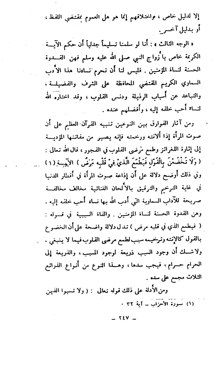 (الوجه الثالث) : أنا لو سلمنا تسليماً جدلياً أن حكم الآية الكريمة خاص بأزواج النبي صلى الله عليه وسلم فهن القدوة الحسنة لنساء المؤمنين. فليس لنا أن نحرم نساءنا هذا الأدب السماوي الكريم المقتضي المحافظة على الشرف والفضيلة، والتباعد عن أسباب الرذيلة ودنس القلوب، وقد اختاره الله لنساء أحب خلقه إليه، وأفضلهم عنده.