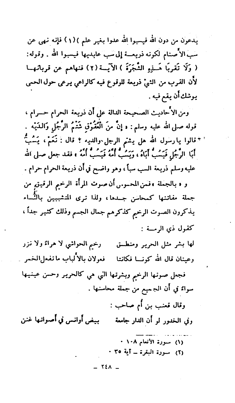 يدعون من دون الله فيسبوا عدوا بغير علم} (¬1) فإنه نهى عن سب الأصنام لكونه ذريعة إلى سب عابديها فيسبوا الله. وقوله: {ولا تقربا هذه الشجرة} الآية (¬2) . فنهاهم عن قربانها لأن القرب من الشيء ذريعة للوقوع فيه كالراعي يرعى حول الحمى يوشك أن يقع فيه.