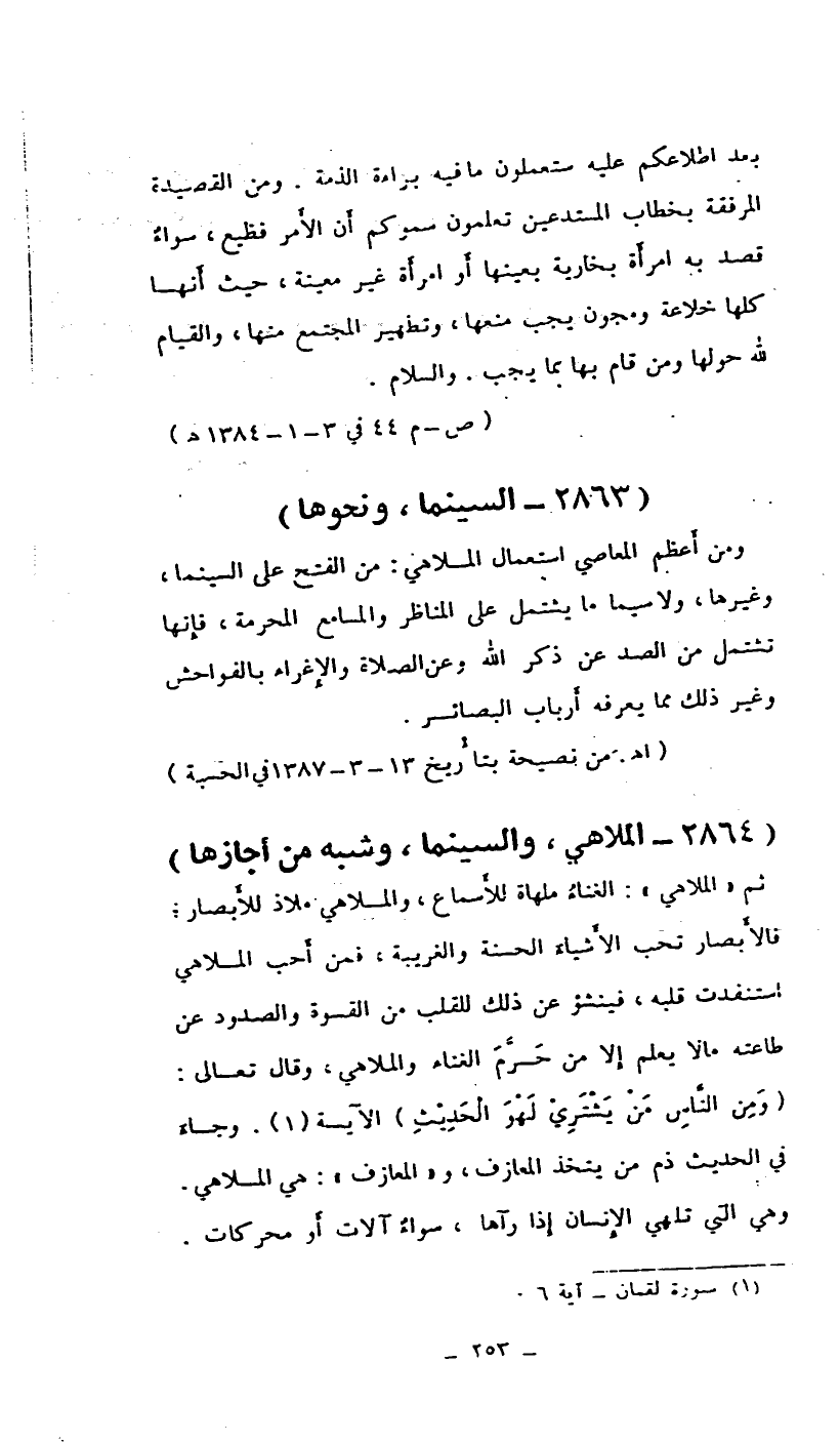ثم (الملاهي) : الغناء ملهاة للأسماع، والملاهي ملاذ للأبصار، فالأبصار تحب الأشياء الحسنة والغريبة، فمن أحب الملاهي استنفدت قلبه، فينشؤ عن ذلك للقلب من القسوة والصدود عن طاعته ما لا يعلم إلا من حرم الغناء والملاهي، وقال تعالى: {ومن الناس من يشتري لهو الحديث} الآية (¬1) . وجاء في الحديث ذم من يتخذ المعازف و (المعازف) : هي الملاهي. وهي التي تلهي الإنسان إذا رآها، سواء آلات أو محركات.