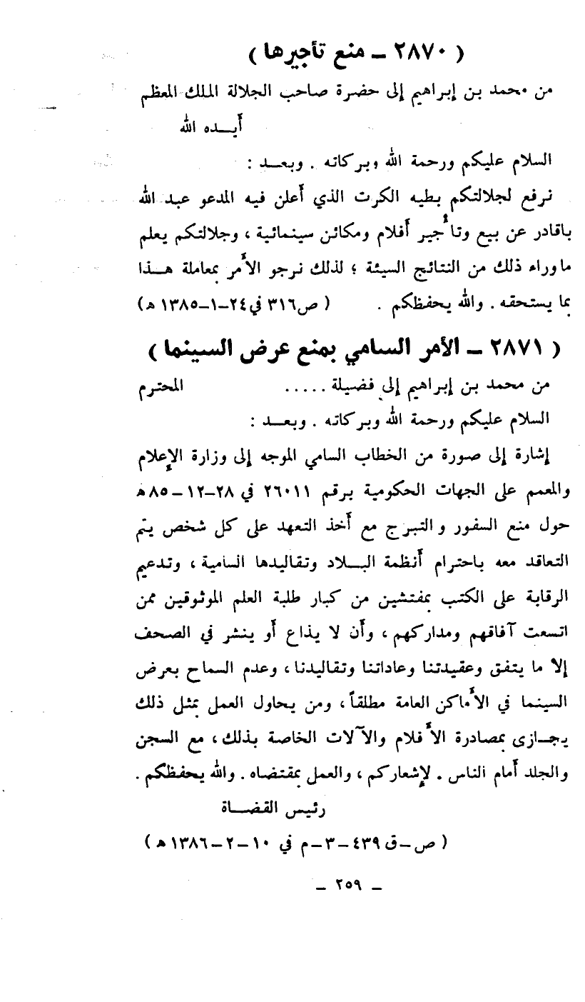 إشارة إلى صورة من الخطاب السامي الموجه إلى وزارة الإعلام والمعمم على الجهات الحكومية برقم 26011 في 28-12-85هـ حول منع السفور والتبرج مع أخذ التعهد على كل شخص يتم التعاقد معه باحترام أنظمة البلاد وتقاليدها السامية، وتدعيم الرقابة على الكتب بمفتشين من كبار طلبة العلم الموثوقين ممن اتسعت آفاقهم ومداركهم، وأن لا يذاع أو ينشر في الصحف إلا ما يتفق وعقيدتنا وعاداتنا وتقاليدنا، وعدم السماح بعرض السينما في الأماكن العامة مطلقاً، ومن يحاول العمل بمثل ذلك يجازى بمصادرة الأفلام والآلات الخاصة بذلك مع السجن والجلد أمام الناس. إشعاركم والعمل بمقتضاه. والله يحفظكم.
