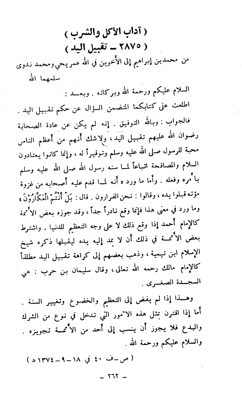 اطلعت على كتابكما المتضمن السؤال عن حكم تقبيل اليد.