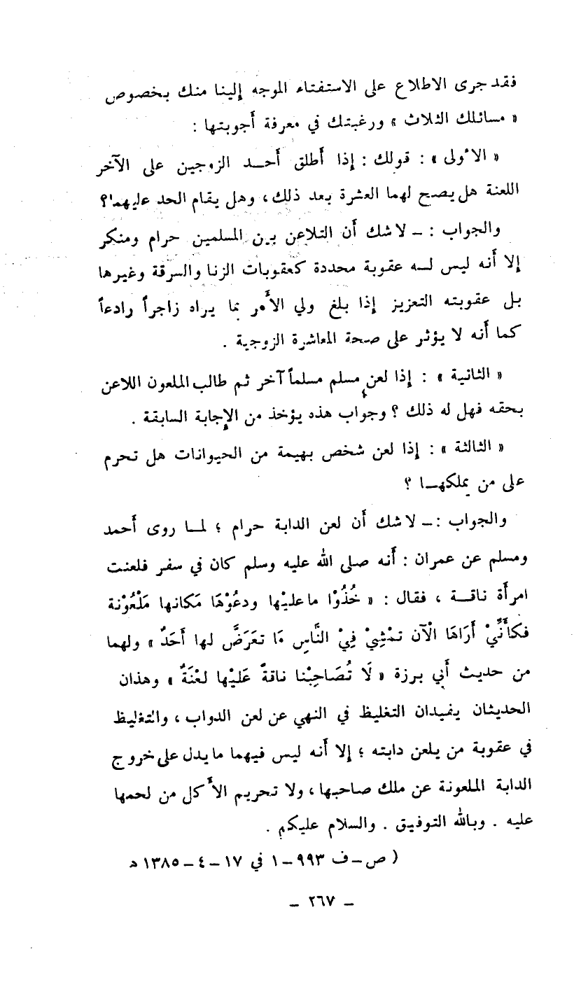 والجواب: لا شك أن لعن الدابة حرام، لما روى أحمد ومسلم عم عمران: أنه صلى الله عليه وسلم كان في سفر فلعنت امرأة ناقة، فقال (خذوا ما عليها ودعوها مكانها ملعونة فكأني أراها الآن تمشي في الناس ما تعرض لها أحد) ولهما من حديث أبي برزة (لا تصاحبنا ناقة عليها لعنة) وهذان الحديثان يفيدان التغليظ في النهي عن لعن الدواب، والتغليظ في عقوبته من يلعن دابته، إلا أنه ليس فيهما ما يدل على خروج الدابة الملعونة عن ملك صاحبها، ولا تحريم الأكل من لحمها عليه. وبالله التوفيق، والسلام عليكم.