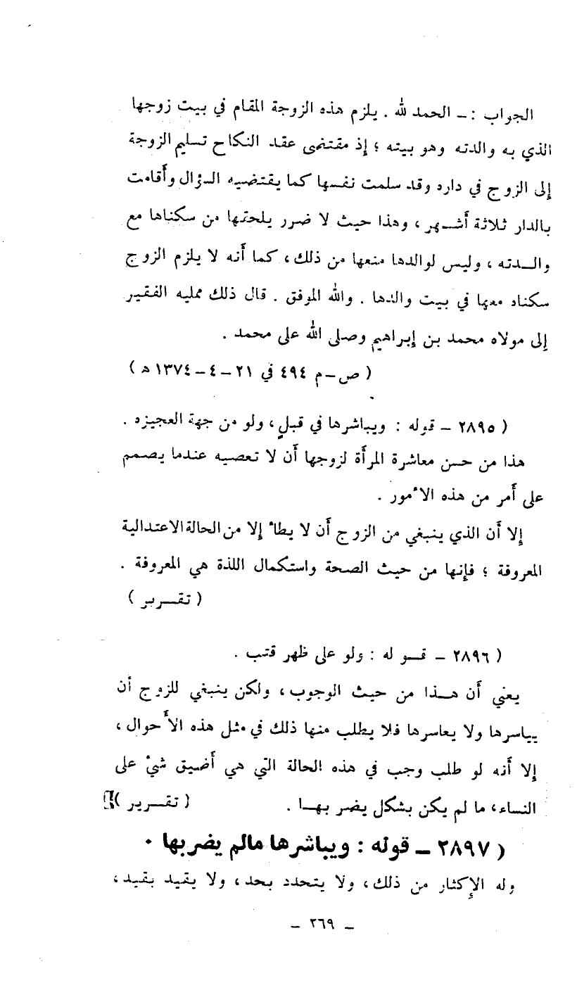 الجواب: الحمد لله. يلزم هذه الزوجة المقام في بيت زوجها الذي به والدته، وهو بيته، إذ مقتضى عقد النكاح تسليم الزوجة إلى الزوج في داره وقد سلمت نفسها كما يقتضيه السؤال وأقامت بالدار ثلاثة أشهر، وهذا حيث لا ضرر يلحقها من سكناها مع والدته، وليس لوالدها منعها في ذلك، كما أنه لا يلزم الزوج سكناه معها في بيت والدها. والله الموفق. قال ذلك ممليه الفقير إلى مولاه محمد بن إبراهيم وصلى الله على محمد.