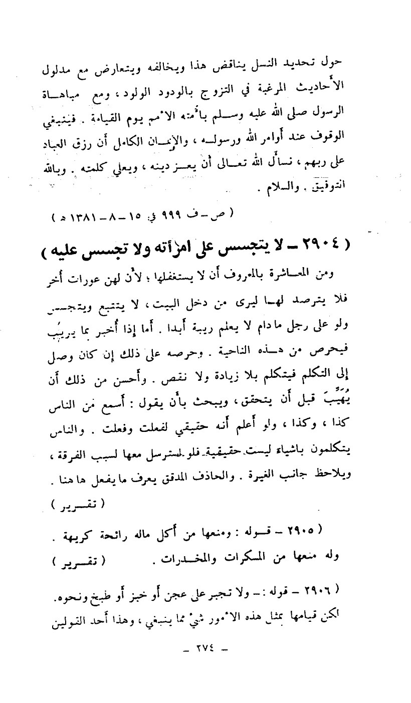 ومن المعاشرة بالمعروف أن لا يستغلها، لأن لهن عورات أخر فلا يترصد لها ليرى من دخل البيت. لا يتتبع ويتجسس ولو على رجل ما دام لا يعلم ريبة أبداً. أما إذا أخبر بما يريب فيحرص من هذه الناحية. وحرصه على ذلك إن كان وصل إلى التكلم فيتكلم بلا زيادة، ولا نقص. وأحسن من ذلك أن يهيب قبل أن يتحقق، ويبحث بأن يقول: أسمع من الناس كذا وكذا، ولو أعلم أنه حقيقي لفعلت وفعلت. والناس يتكلمون بأشياء ليست حقيقية فلو استرسل معها لسبب الفرقة، ويلاحظ جانب الغيرة. والحاذف المدقق يعرف ما يفعل ها هنا.