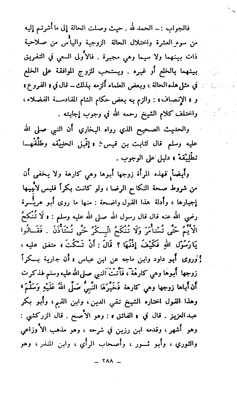 وأيضاً فهذه المرأة زوجها أبوها وهي كارهة ولا يخفى أن من شروط صحة النكاح الرضا، ولو كانت بكراً فليس لأبيها إجبارها، وأدلة هذا القول واضحة: منها ما روى أبو هريرة رضي الله عنه قال: قال رسول الله صلى الله عليه وسلم: (لا تنكح الأيم حتى تستأمر ولا تنكح البكر حتى تستأذن. فقالوا يا رسول الله فكيف إذنها؟ قال: أن تسكت) متفق عليه، وروى أبو داود وابن ماجه عن ابن عباس أن جارية بكراً زوجها أبوها وهي كارهة فخيرها النبي صلى الله عليه وسلم وهذا القول اختاره الشيخ تقي الدين، وابن القيم، وأبو بكر عبد العزيز قال في (الفائق) : وهو الأصح. قال الزركشي: وهو أشهر، وقدمه ابن رزين في شرحه، وهو مذهب الأوزاعي والثوري، وأبو ثور، وأصحاب الرأي، وابن المنذر، وهو