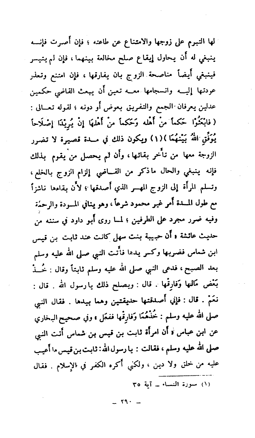لها التبرم على زوجها والامتناع عن طاعته، فإن أصرت فإنه ينبغي له أن يحاول إيقاع صلح مخالعة بينهما، فإن لم يتيسر فينبغي أيضاً مناصحة الزوج بأن يفارقها، فإن امتنع وتعذر عودتها إليه وانسجامها معه تعين أن يبعث القاضي حكمين عدلين يعرفان الجمع والتفريق بعوض أو دونه، لقوله تعالى: {فابعثوا حكماً من أهله وحكماً من أهلها إن يريدا إصلاحاً يوفق الله بينهما} (¬1) ويكون ذلك في مدة قصيرة لا تضرر الزوجة معها من تأخر بقائها، وأن لم يحصل من يقوم بذلك فإنه ينبغي والحال ما ذكر من القاضي إلزام الزوج بالخلع، وتسلم المرأة إلى الزوج المهر الذي أصدقها، لأن بقاءها ناشزاً مع طول المدة أمر غير محمود شرعاً، وهو ينافي المودة والرحمة وفيه ضرر مجرد على الطرفين، لما روى أبو داود في سننه من حديث عائشة (أن حبيبة بنت سهل كانت عند ثابت بن قيس أن شماس فضربها وكسر يدها فأتت النبي صلى الله عليه وسلم بعد الصبح فدعى النبي صلى الله عليه وسلم ثابتاً وقال: خذ بعض مالها وفارقها. قال: ويصلح ذلك يا رسول الله. قال: نعم. قال: فإني أصدقتها حديقتين وهما بيدها، فقال النبي صلى الله عليه وسلم. خذهما وفارقها ففعل) وفي صحيح البخاري عن ابن عباس أن امرأة ثابت بن قيس بن شماس أتت النبي صلى الله عليه وسلم، فقال: يا رسول الله: ثابت بن قيس ما أعيب عليه من خلق ولا دين، ولكني أكره الكفر في الإسلام. فقال