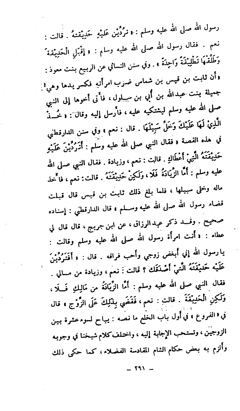 فقال رسول الله صلى الله عليه وسلم: (إقبل الحديقة وطلقها تطليقة واحدة) وفي سنن النسائي عن الربيع بنت معوذ: أن ثابت بن قيس بن شماس ضرب امرأته فكسر يدها وهي جميلة بنت عبد الله بن أبي بن سلول، فأتي أخوها إلى النبي صلى الله عليه وسلم ليشتكيه عليه، فأرسل إليه وقال: (خذ الذي لها عليك وخل سبيلها. قال: نعم) وفي سنن الدارقطني في هذه القصة (فقال النبي صلى الله عليه وسلم: أما الزيادة فلا، ولكن حديقته. قالت: نعم، فأخذ ماله وخلى سبيلها، فلما بلغ ذلك ثابت بن قيس قال: قبلت قضاء رسول الله صلى الله عليه وسلم) قال الدارقطني: إسناده صحيح. وقد ذكر عبد الرزاق، عن ابن جريج، قال: قال لي عطاء: (أتت امرأة رسول الله صلى الله عليه وسلم وقالت: يا رسول الله إني أبغض زوجي وأحب فرقه. قال: (أفتردين عليه حديقته التي أصدقك؟ قالت: نعم وزيادة من مالي. فقال النبي صلى الله عليه وسلم: أما الزيادة من مالك فلا، ولكن الحديقة. قالت: نعم، فقضى بذلك على الزوج) قال في (الفروع) في أول باب الخلع ما نصه: يباح لسوء عشرة بين الزوجين، وتستحب الإجابة إليه، واختلف كلام شيخنا في وجوبه وألزم به بعض حكام الشام المقادسة الفضلاء، كما حكى ذلك