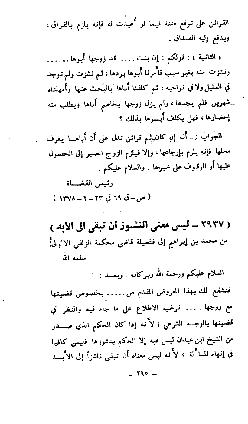 فنشفع لك بهذا المعروض المقدم من.... بخصوص قضيتها مع زوجها ... ترغب الاطلاع على ما جاء فيه والنظر في قضيتها بالوجه الشرعي، لأنه إذا كان الحكم الذي صدر من الشيخ ابن عيدان ليس فيه إلا الحكم بنشوزها فليس كافياً في إنهاء المسألة، لأنه ليس معناه أن تبقى ناشزاً إلى الأبد