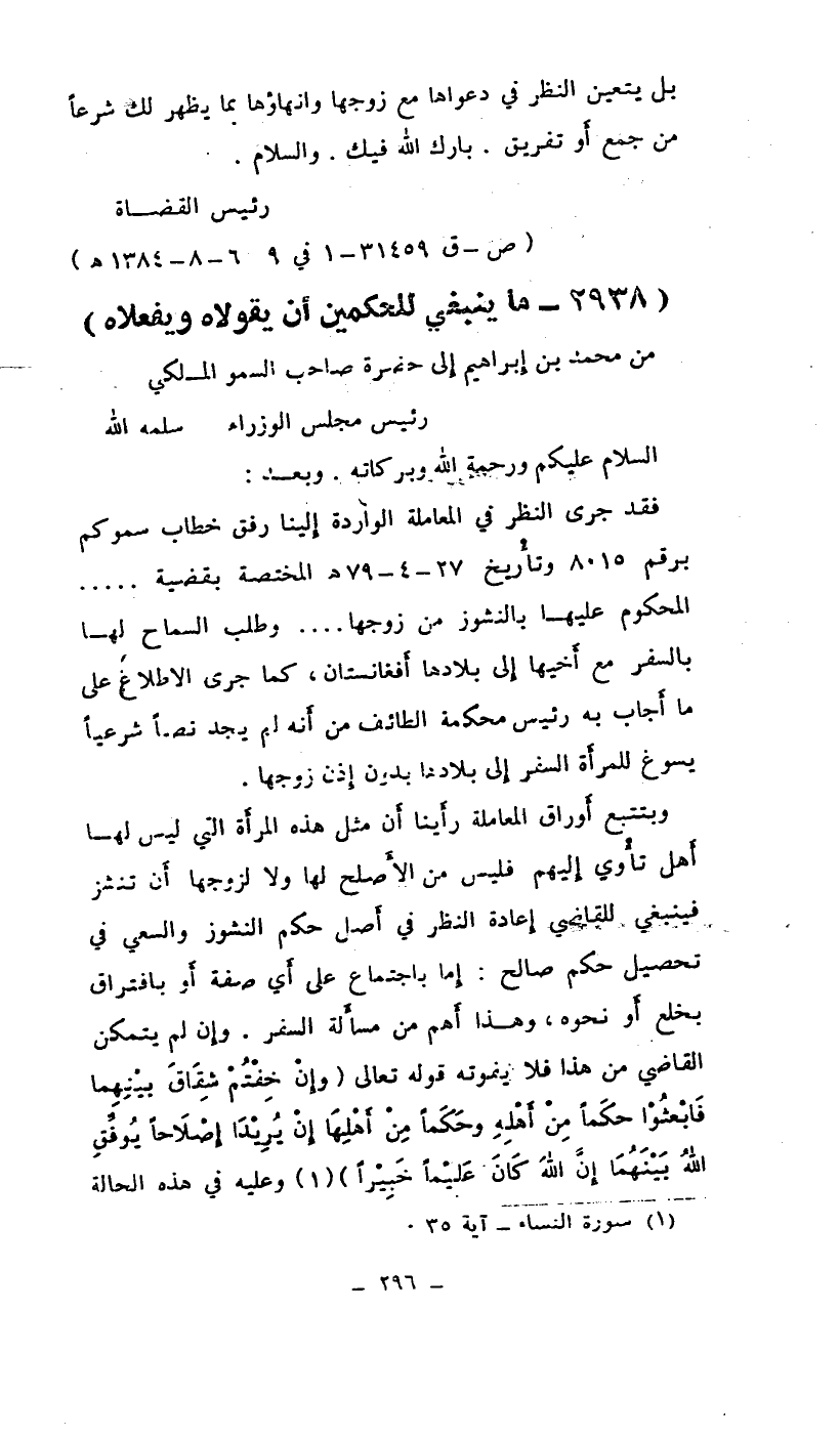 فقد جرى النظر في المعاملة الواردة إلينا رفق خطاب سموكم برقم 8015 وتاريخ 27-4-79هـ المختصة بقضية.... المحكوم عليها بالنشوز من زوجها ... وطلب السماح لها بالسفر مع أخيها إلى بلادها أفغانستان. كما جرى الاطلاع على ما أجاب به رئيس محكمة الطائف من أنه لم يجد نصاً شرعياً يسوغ للمرأة السفر إلى بلادها بدون إذن زوجها.