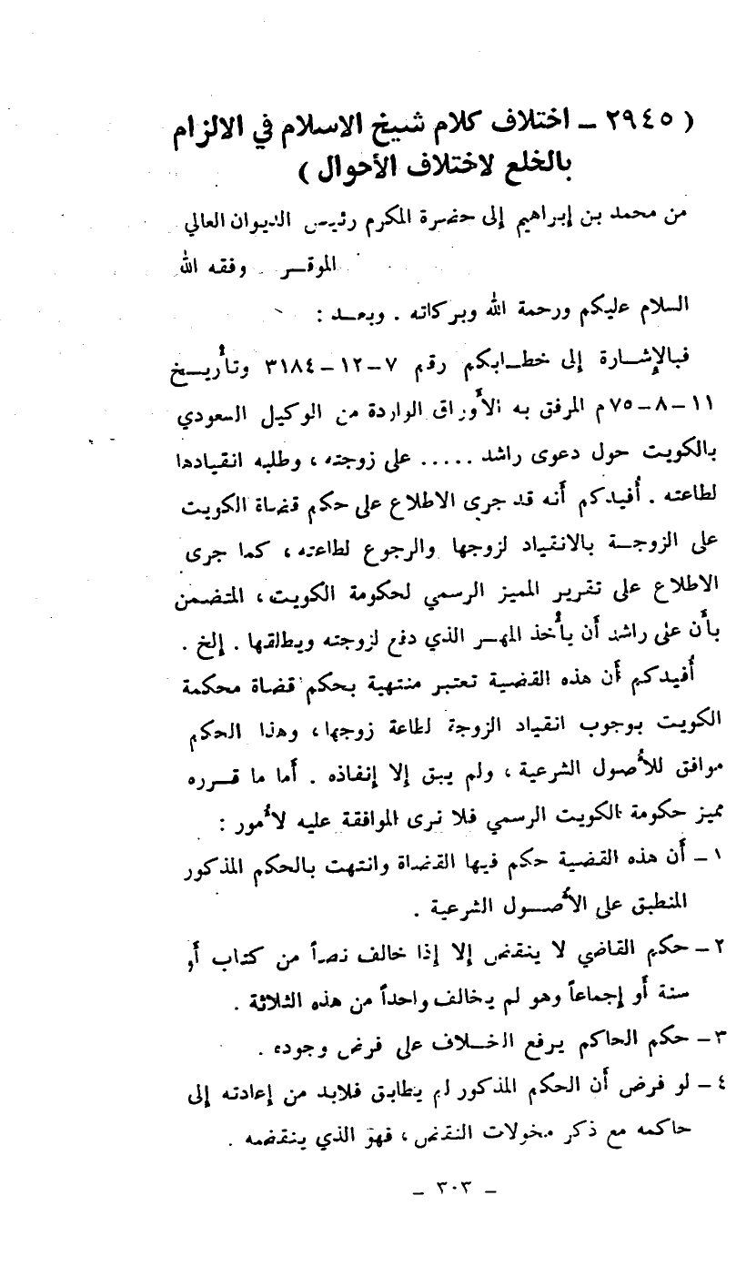 فبالإشارة إلى خطابكم رقم 7-12-3184 وتاريخ 11-8-75هـ المرفق به الأرواق الواردة من الوكيل السعودي بالكويت حول دعوى راشد ... على زوجته، وطلبه انقيادها لطاعته، أفيدكم أنه قد جرى الإطلاع على حكم قضاء الكويت على الزوجة بالانقياد لزوجها والرجوع لطاعته، كما جرى الإطلاع على تقرير المميز الرسمي لحكومة الكويت، المتضمن بأن على راشد أن يأخذ المهر الذي دفع لزوجته ويطلقها ... إلخ.