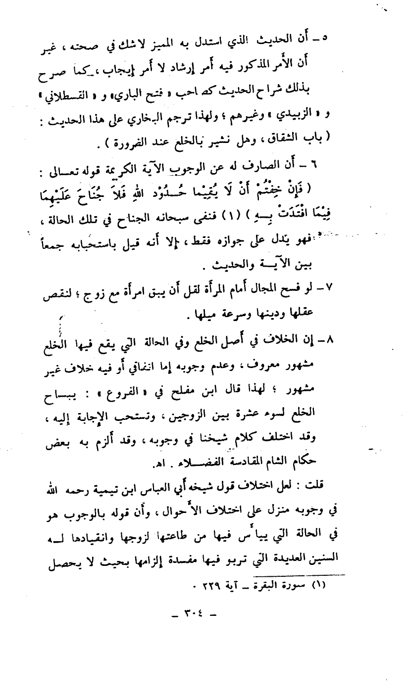 8. إن الخلاف في أصل الخلع وفي الحالة التي يقع فيها الخلع مشهور معروف، وعدم وجوبه إما اتفاقي أو فيه خلاف غير مشهور، لهذا قال ابن مفلح في (الفروع) : يباح الخلع لسوء عشرة بين الزوجين، وتستحب الإجابة إليه، وقد اختلف كلام شيخنا في وجوبه، وقد ألزم به بعض حكام الشام المقادسة الفضلاء. اهـ.