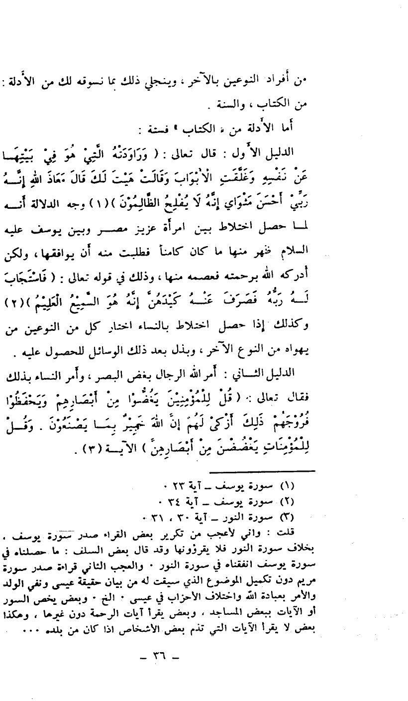الدليل الأول: قال تعالى: {وراودته التي هو في بيتها عن نفسه وغلقت الأبواب وقالت هيت لك قال معاذ الله إنه ربي أحسن مثواي إنه لا يفلح الظالمون} (¬1) وجه الدلالة أنه لما حصل اختلاط بين امرأة عزيز مصر وبين يوسف عليه السلام ظهر منها ما كان كامناً فطلبت منه أو يوافقها، ولكن أدركه الله برحمته فعصمه منها، وذلك في قوله تعالى: {فاستجاب له ربه فصرف عنه كيدهن إنه هو السميع العليم} (¬2) وكذلك إذا حصل اختلاط بالنساء اختار كل من النوعين من يهواه من النوع الآخر، وبذل بعد ذلك الوسائل للحصول عليه.
