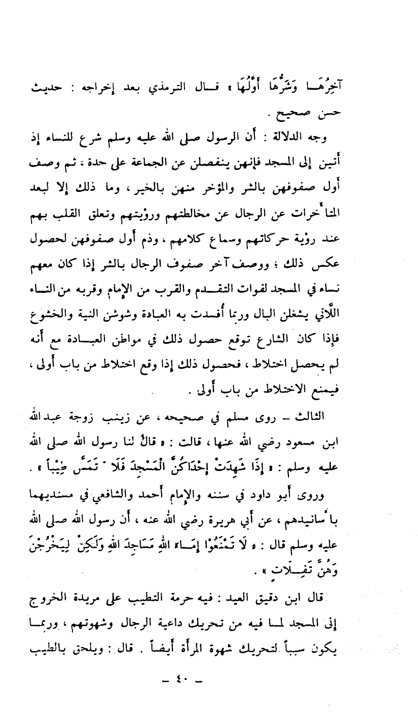 وجه الدلالة: أن الرسول صل الله عليه وسلم شرع للنساء إذا أتين إلى المسجد فإنهن ينفصلن عن الجماعة على حده، ثم وصف أول صفوفهن بالشر والمؤخر منهن بالخير. وما ذلك إلا لبعد المتأخرات عن الرجال عن مخالطتهم ورؤيتهم وتعلق القلب بهم عند رؤية حركاتهم وسماع كلامهم، وذم أول صفوفهن لحصول عكس ذلك، ووصف آخر صفوف الرجال بالشر إذا كان معهم نساء في المسجد لفوات التقدم والقرب من الإمام وقربه من النساء اللاتي يشغلن البال وربما أفسدت به العبادة وشوشن النية والخشوع. فإذا كان الشرع توقع حصول ذلك في مواطن العبادة مع أنه لم يحصل اختلاط، فحصول ذلك إذا وقع اختلاط من باب أولى، فيمنع الاختلاط من باب أولى.