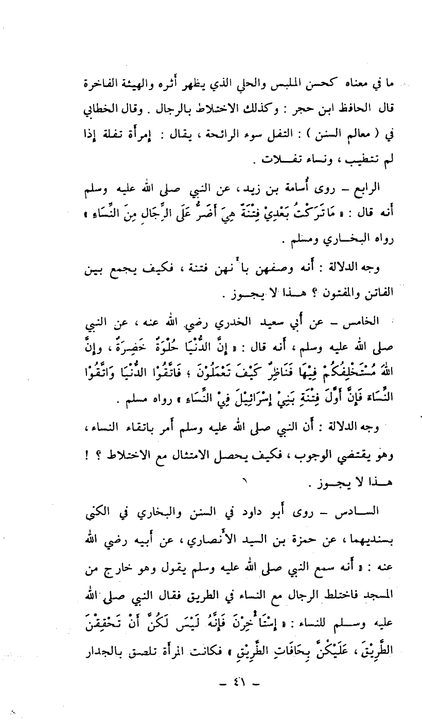 الرابع: روى أسامة بن زيد عن النبي صلى الله عليه وسلم أنه قال: (ما تركت بعدي فتنة هي أضر على الرجال من النساء) رواه البخاري ومسلم.