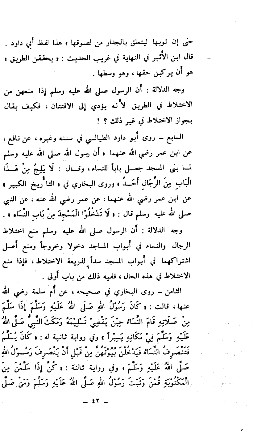 السابع: روى أبو داود الطيالسي في سننه وغيره، عن نافع عن ابن عمر رضي الله عنهما (أن رسول الله صلى الله عليه وسلم لما بنى المسجد جعل باباً للنساء، وقال لا يلج من هذا الباب من الرجال أحد) وروى البخاري في (التاريخ الكبير) عن ابن عمر رضي الله عنهما، عن عمر رضي الله عنه عن النبي صلى الله عليه وسلم قال: (لا تدخلوا المسجد من باب النساء) .