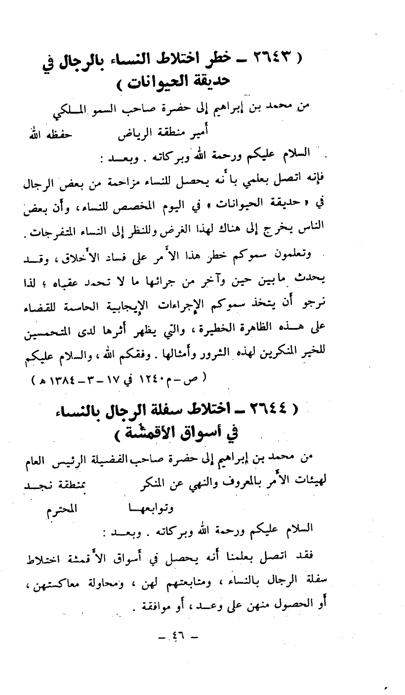وتعلمون سموكم خطر هذا الأمر على فساد الأخلاق، وقد يحدث ما بين حين وآخر من جرائها ما لا تحمد عقباه لذا نرجو أن يتخذ سموكم الإجراءات الإيجابية الحاسمة للقضاء على هذه الظاهرة الخطيرة والتي يظهر أثرها لدى المتحمسين للخير المنكرين لهذه الشرور وأمثالها. وفقكم الله والسلام عليكم.