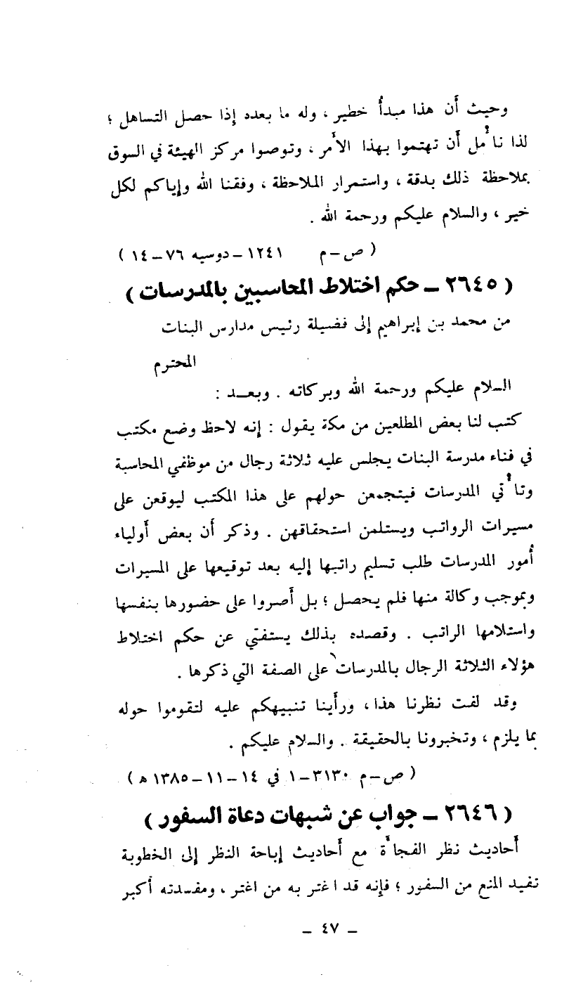 كتب لنا بعض المطلعين من مكة يقول: إنه لاحظ وضع مكتب في فناء مدرسة البنات يجلس عليه ثلاثة رجال من موظفي المحاسبة وتأتي المدرسات فيجتمعن حولهم على هذا المكتب ليوقعن على مسيرات الرواتب ويستملن استحقاقهن. وذكر أن بعض أولياء أمور المدرسات طلب تسليم راتبها إليه بعد توقيعها على المسيرات وبموجب وكالة منها فلم يحصل، بل أصروا على حضورها بنفسها واستلامها الراتب. وقصده بذلك يستفتي عن حكم اختلاط هؤلاء الثلاثة الرجال بالمدرسات على الصفة التي ذكرها.