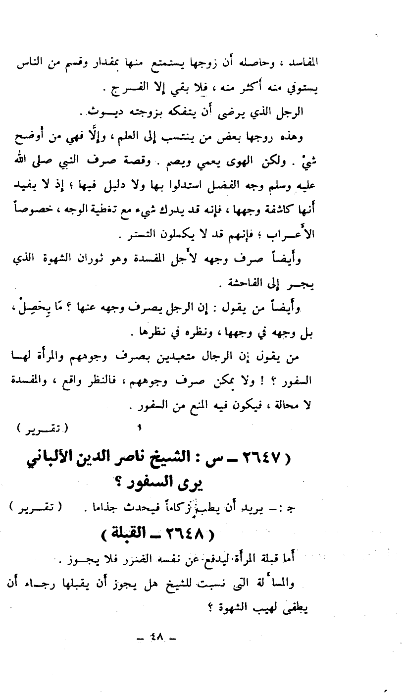 من يقول إن الرجال متعبدين بصرف وجوههم والمرأة لها السفور؟! ولا يمكن صرف وجوههم فالنظر واقع والمفسدة لا محالة، فيكون فيه المنع من السفور.