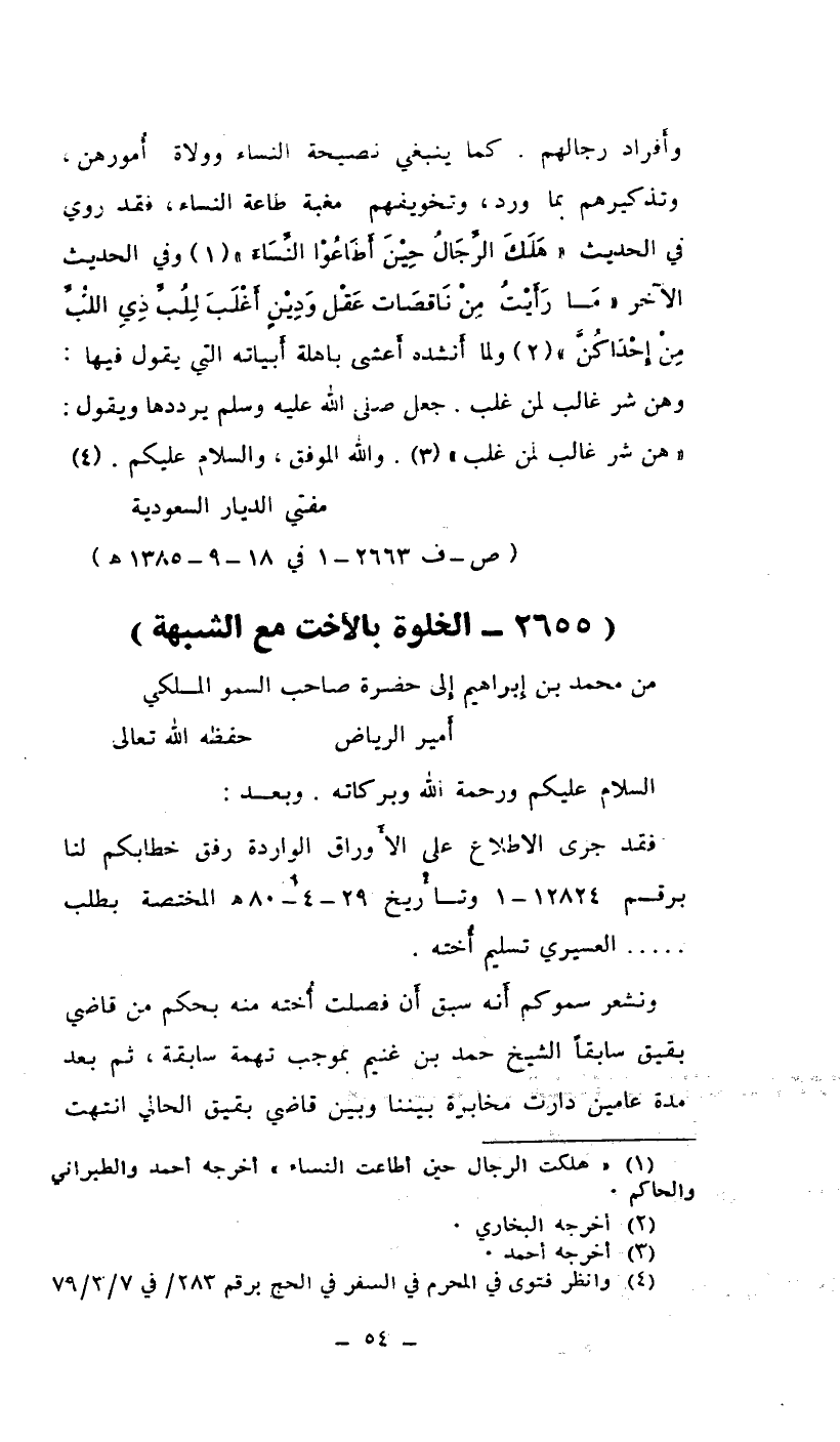 وأفراد رجالهم. كما ينبغي نصيحة هؤلاء النساء وولاة أمورهن، وتذكيرهم بما ورد، وتخويفهم مغبة طاعة النساء، فقد روي في الحديث (هلك الرجال حين أطاعوا النساء) (¬1) ، وفي الحديث الآخر (ما رأيت من ناقصات عقل ودين أغلب للب ذي اللب من إحداكن) (¬2) ولما أنشده أعشى باهله أبياته التي يقول فيها: وهن شر غالب لمن غلب. جعل صلى الله عليه وسلم يرددها ويقول: (هن شر غالب لمن غلب) (¬3) . والله الموفق، والسلام عليكم (¬4) .