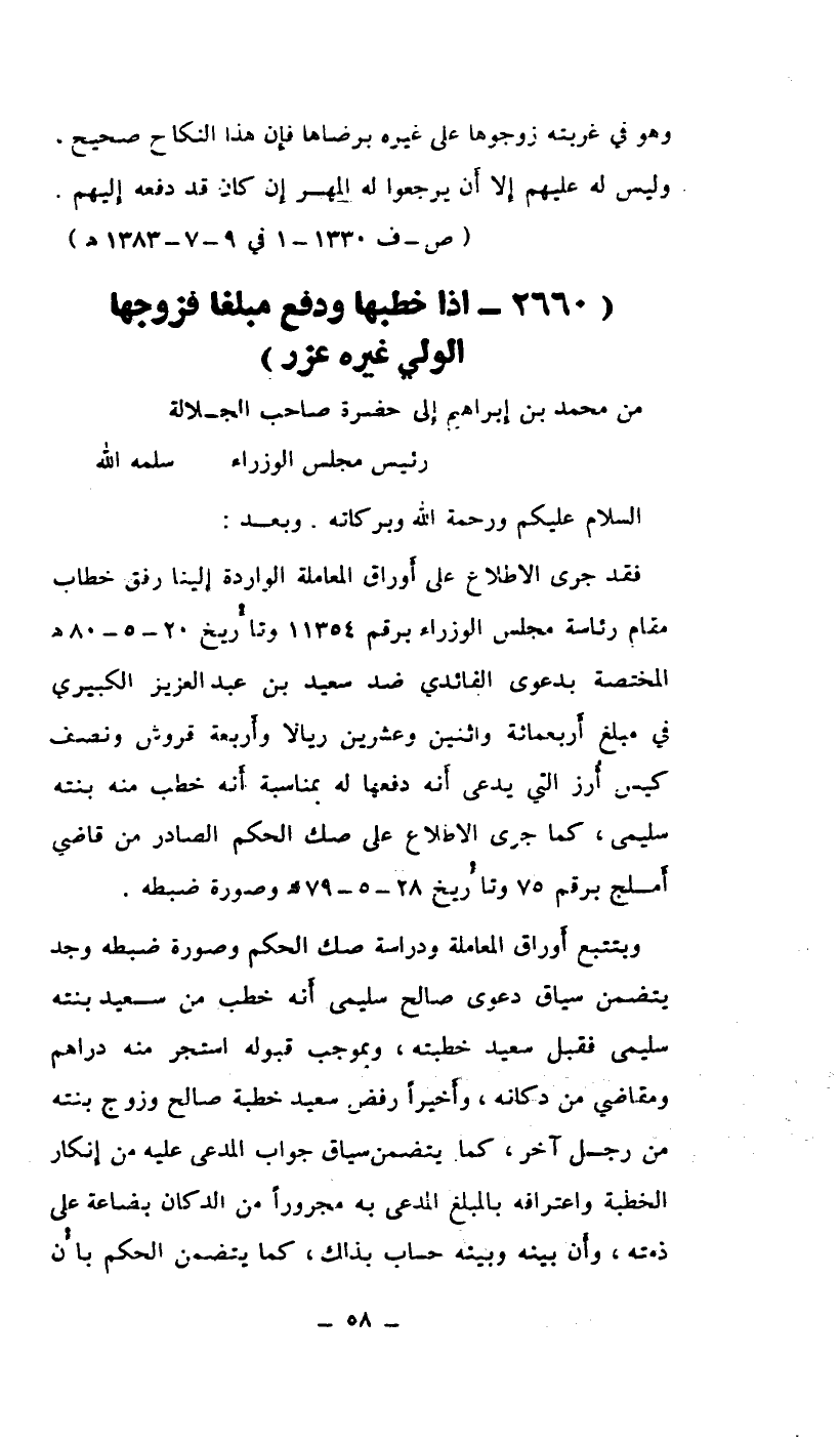 فقد جرى الإطلاع على أوراق المعاملة الواردة إلينا رفق الخطاب مقام رئاسة مجلس الوزراء برقم 11354 وتاريخ 20-5-80هـ المختصة بدعوى الفائدي ضد سعيد بن عبد العزيز الكبيري في مبلغ أربعمائة واثنين وعشرين ريالاً وأربعة قروش ونصف كيس أرز التي يدعي أنه دفعها له بمناسبة أنه خطب منه بنته سليمى، كما جرى الإطلاع على صك الحكم الصادر من قاضي أملج برقم 75 وتاريخ 28-5-79هـ وصنورة ضبطه.