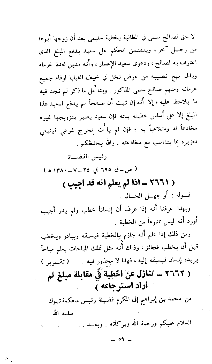 لا حق لصالح سلمى في المطالبة بعد أن زوجها أبوها من رجل آخر. ويتضمن الحكم على سعيد بدفع المبلغ الذي اعترف به لصالح ودعوى سعيد الأعسار أنه مدين لعدة غرماء وبذل بيع نصيبه من حوض نخل في خيف الغبايا لوفاء جميع غرمائه ومنهم صالح سلمى المذكور. وبتأمل ما ذكر لم نجد فيه ما يلاحظ عليه، إلا أنه إن ثبت أن صالحاً لم يدفع لسعيد هذا المبلغ إلا على أساس خطبته بنته فإن سعيد يعتبر بتزويجها غيره مخادعاً له ومتلاعباً به، فإن لم يأت بمخرج شرعي فينبغي تعزيره بما يتناسب مع مخادعته. والله يحفظكم.