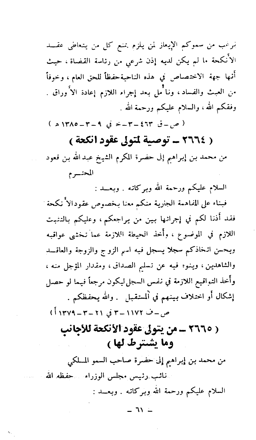 فبناء على المفاهمة الجارية منكم معنا بخصوص عقود الأنكحة فقد أذنا لكم في إجراءها بين من يراجعكم وعليكم بالتثبت اللازم في الموضوع، وأخذ الحيطة اللازمة عما تخشى عواقبه ويحسن اتخاذكم سجلاً يسجل فيه اسم الزوج والزوجة والعاقد والشاهدين، وينوه فيه عن تسليم الصداق ومقدار المؤجل منه، وأخذ التواقيع اللازمة في نفس السجل ليكون مرجعاً فيما لو حصل إشكال أو اختلاف بينهم في المستقبل. والله يحفظكم.