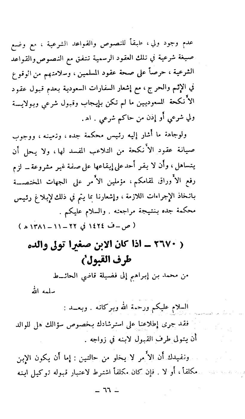 عدم وجود ولي، طبقاً للنصوص والقواعد الشرعية، مع وضع صيغة شرعية في تلك العقود الرسمية تتفق مع النصوص والقواعد الشرعية، حرصاً على صحة عقود المسلمين، وسلامتهم من الوقوع في الإثم والحرج، مع إشعار السفارات السعودية بعدم قبول عقود الأنكحة للسعوديين ما لم تكن بإيجاب وقبول شرعي وبولاية ولي شرعي أو إذن من حاكم شرعي. اهـ.