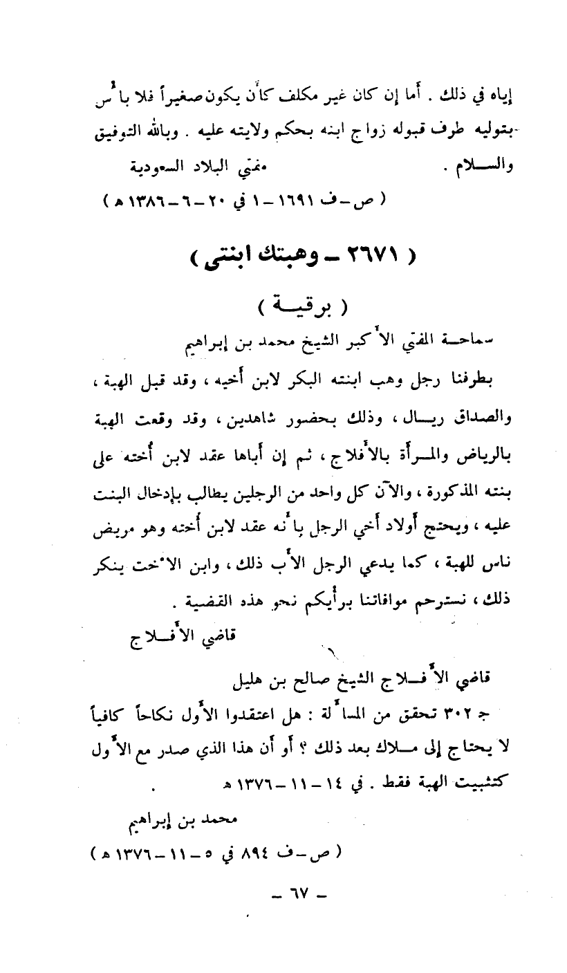 جـ 302 تحقق من المسألة: هل اعتقدوا الأول نكاحاً كافياً لا يحتاج إلى ملاك بعد ذلك؟ أو أن هذا الذي صدر مع الأول كتثبيت الهبة فقط. في 14-11-1376هـ.